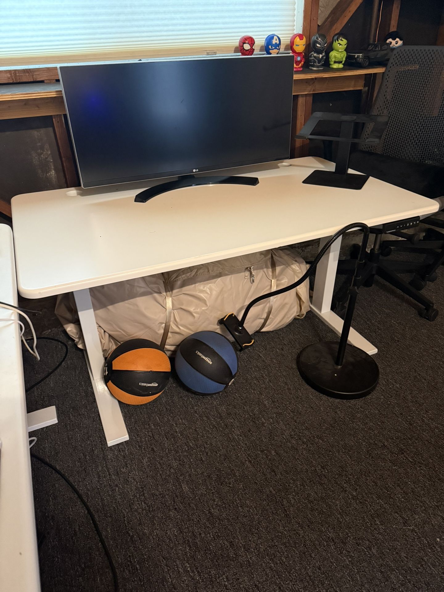 Selling an adjustable standing desk, LG wide monitor and office chair chairs. - Desk: $100 - Monitor: $50 - Chairs: $30 each