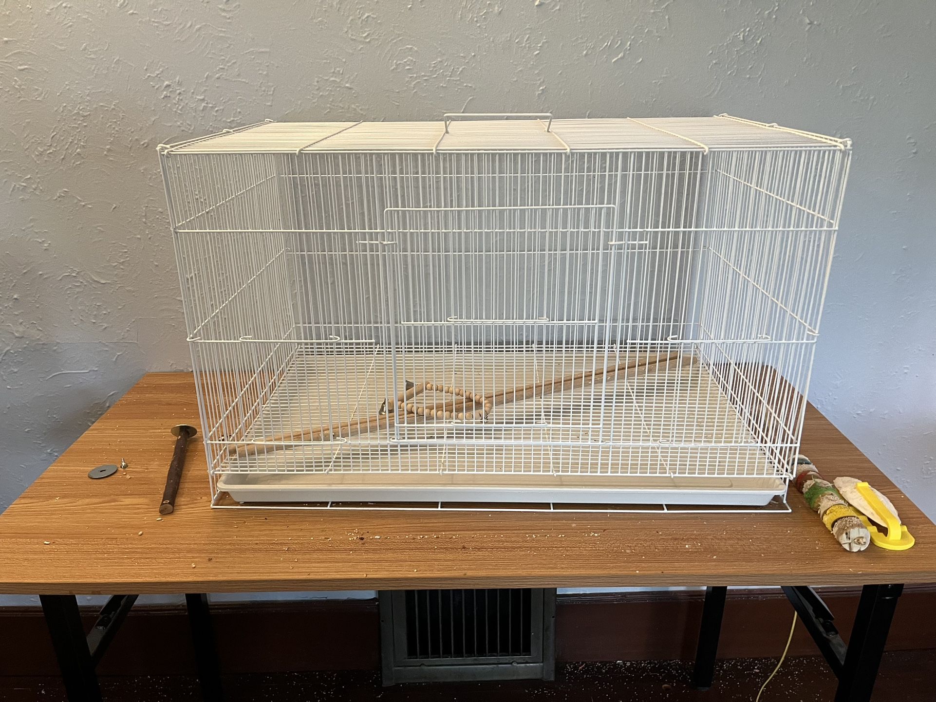 Only used for a couple weeks. Clean, comes with two perches and two plastic food bowls. Perfect size for Parakeet/ Parrotlet/ Love Bird/ small dove/ Bourke Parrot. Pick Up Only in Kirkland. Size: 28 inch wide 17” Depth 16” Height
