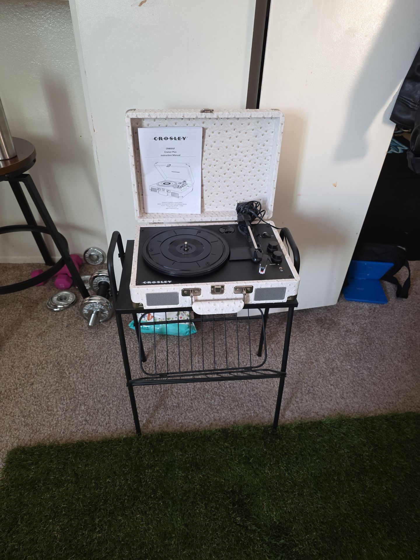 Like new used once Crosley record player Bluetooth inside plus you can use your own Bluetooth speakers for sound comewith record player stand both for $25