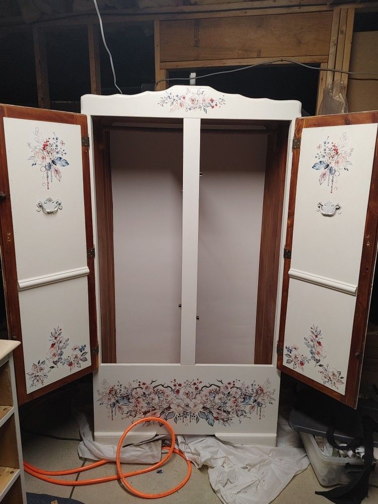Fully reconditioned cedar wardrobe. Outside painted soft white with floral boho transfers and sealed. Has new hinges and door pulls with the original key hole. Inside cedar has been sanded and oiled to restore its beauty. It has a bar for hanging clothes and is 14" deep in the front for placing blankets, boots, etc. in the bottom. W 36" D 21" H 67" $295 or best reasonable offer