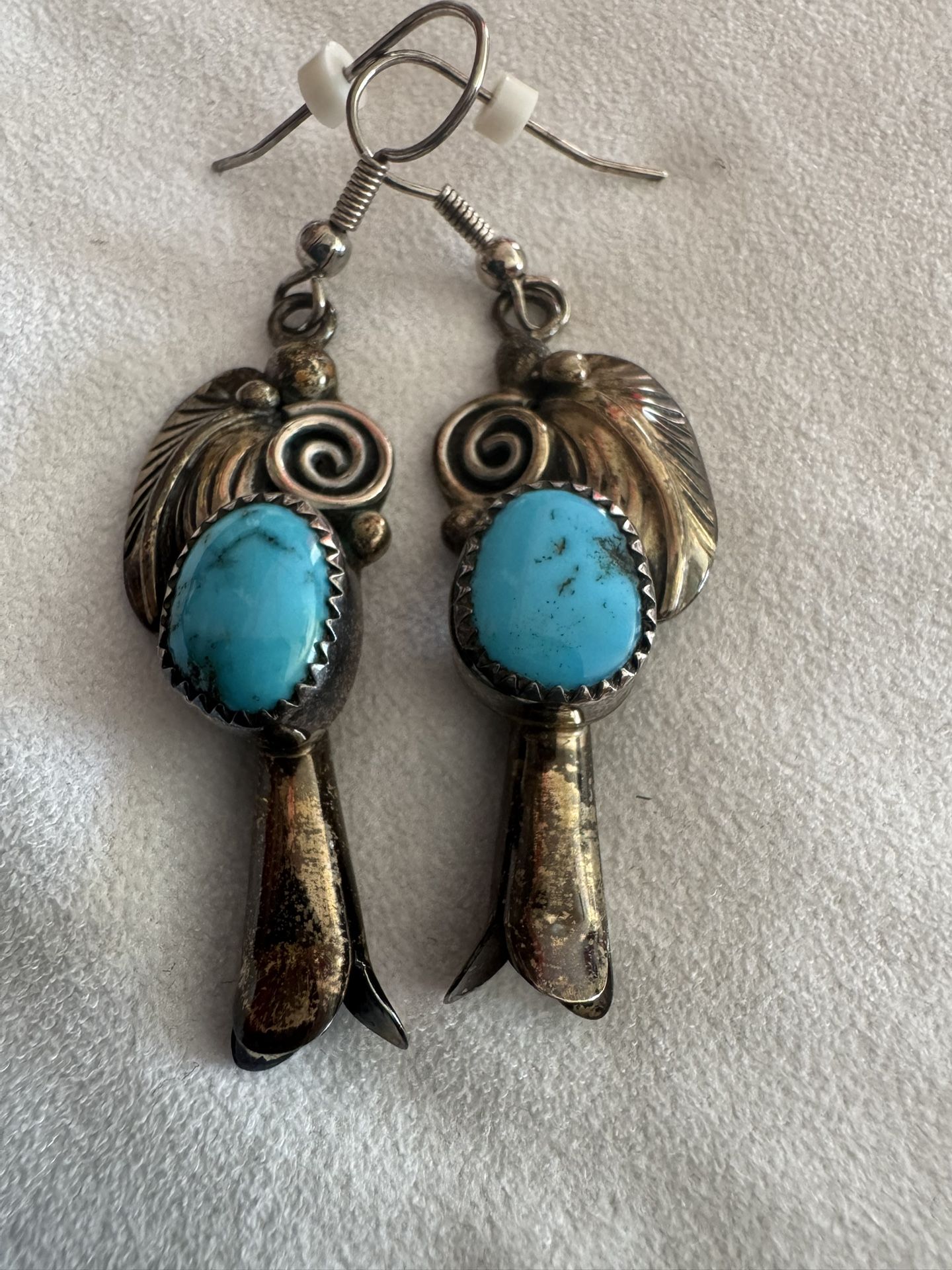 Contemporary Navajo artist Tom Hasteen's beautiful design. Handcrafted exquisite detailed pierced earrings with turquoise stones. Dangle style fish hook backs. I have not cleaned these. From the late 1960's. These weigh 10g. Signed Hasteen Sterling. Approximately 2" dangle.