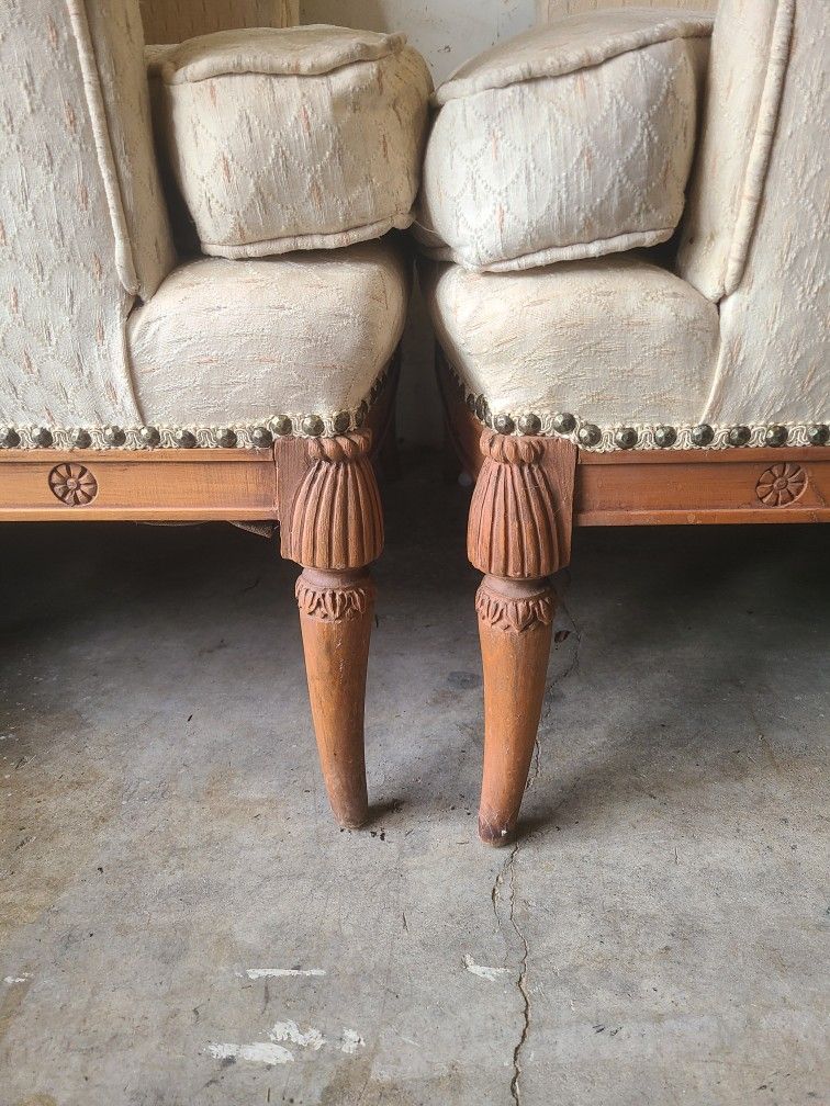 Been saving these for years to clean up but haven't found the time. Wood, engravings, backs, and fasteners are in great condition, just need to be cleaned or reupholstered. Heavy chairs. Price is for both