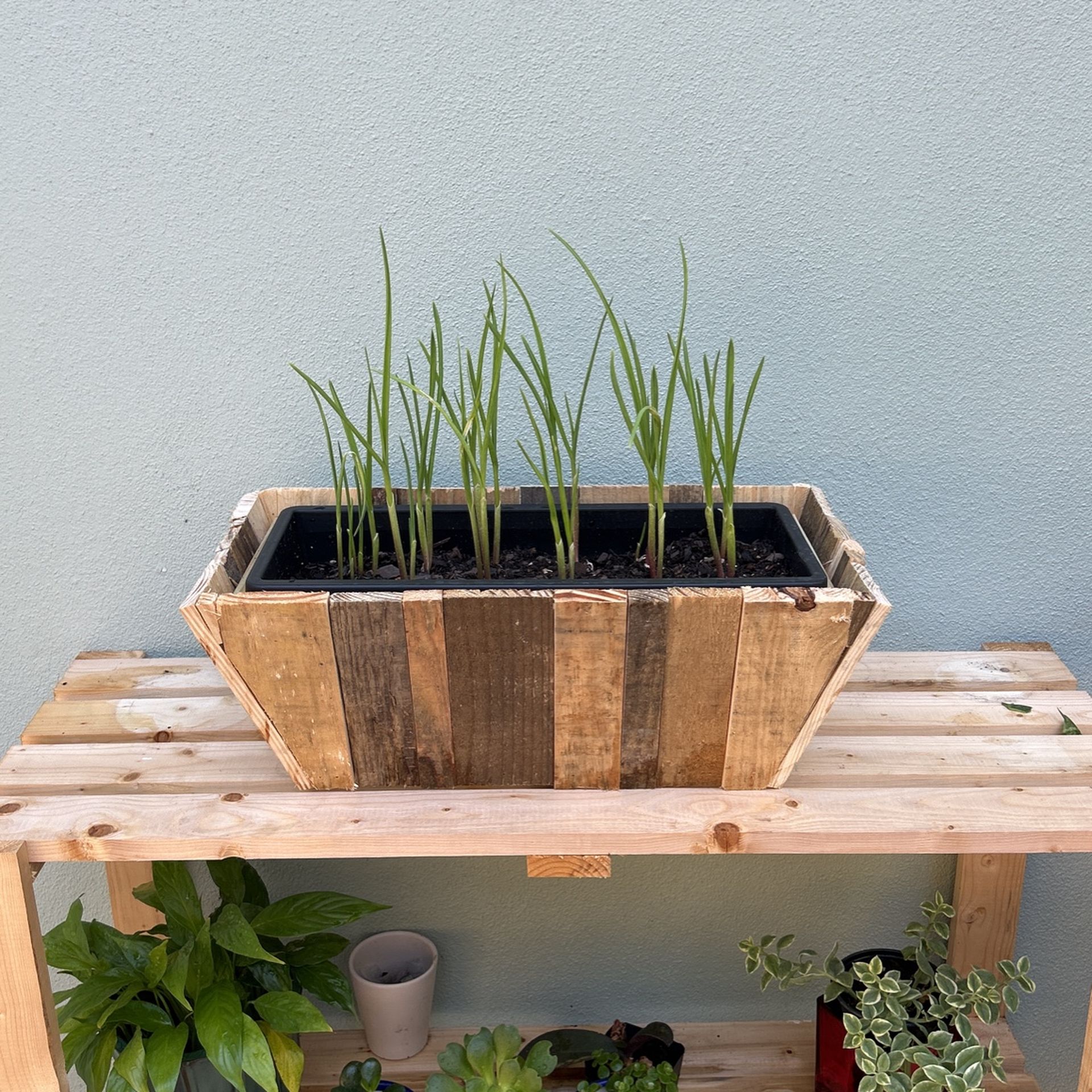 Reclaimed wood planter box, with self watering plant liner Comes with garlic plants in photo Dimensions are 10 W x 20 D x 8 H