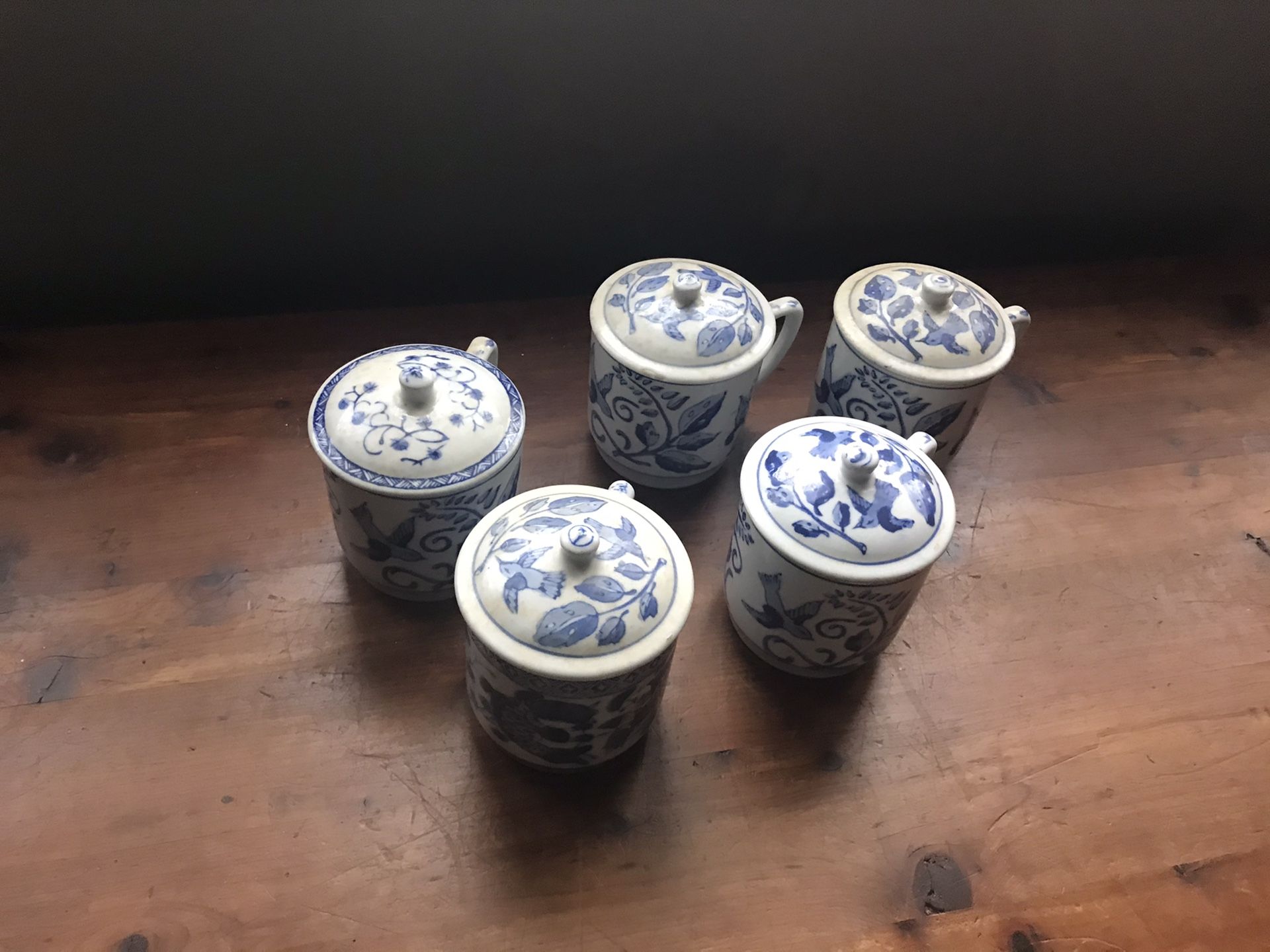 A complete 5 cup set of blue ware cups with their lids. Great shape, great gift idea