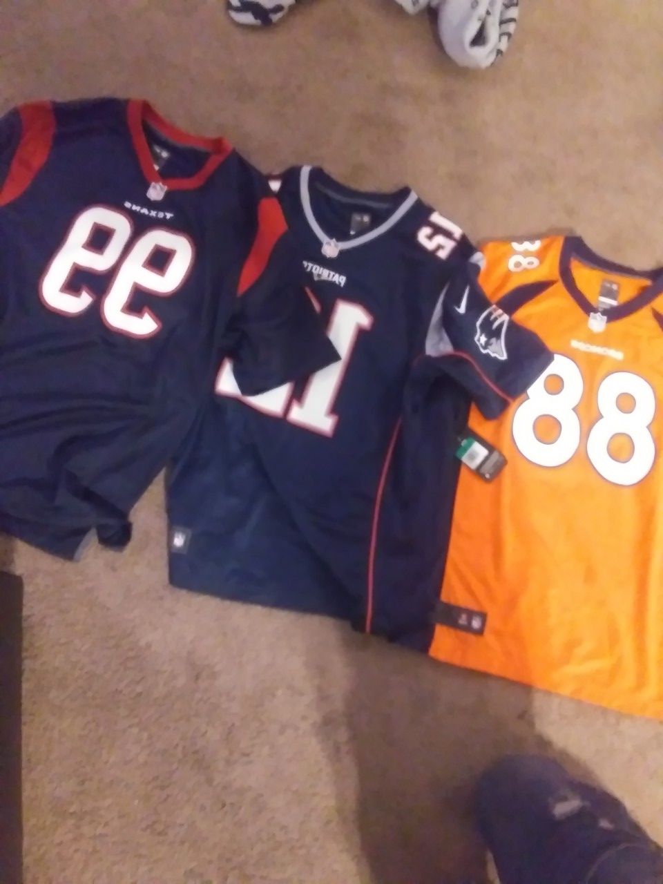 Authentic jerseys that are brand new. Broncos texans and patriots. They all retail for 100$ a piece. Tags still on. The jerseys are all XL. Selling for 40$ a piece