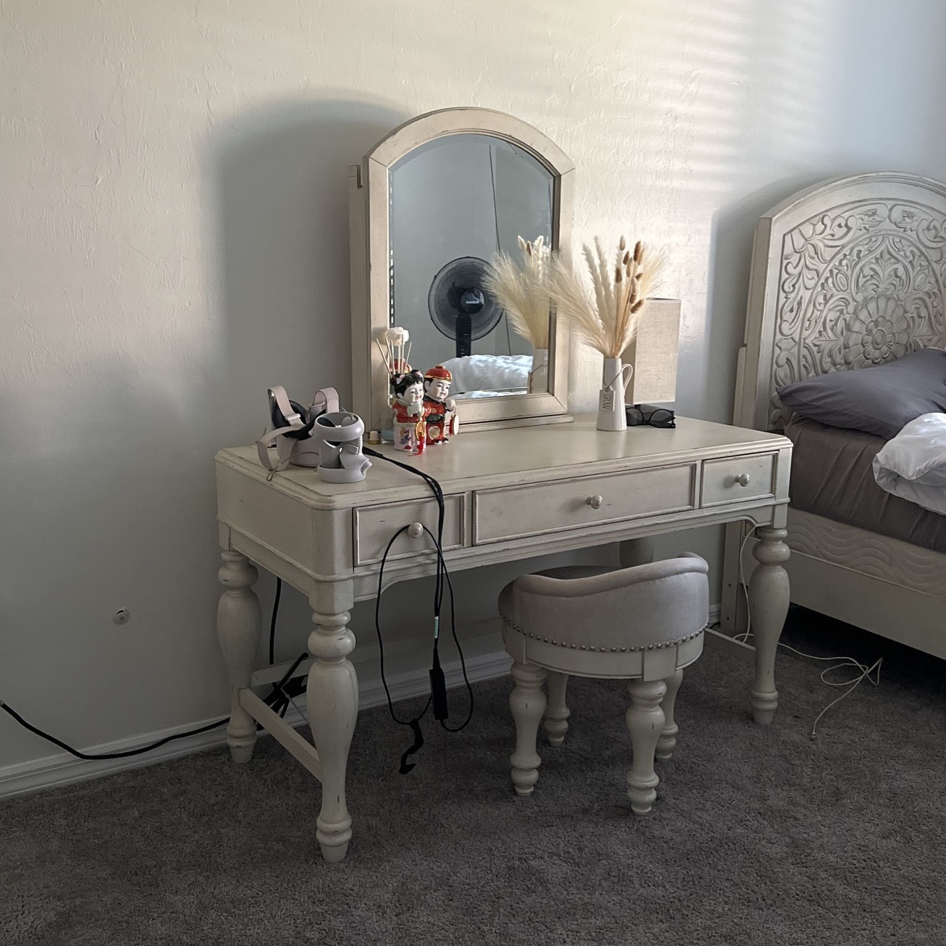 Wooden vanity room set with bed and mattress and stool included size twin color off white to look like antique (original )