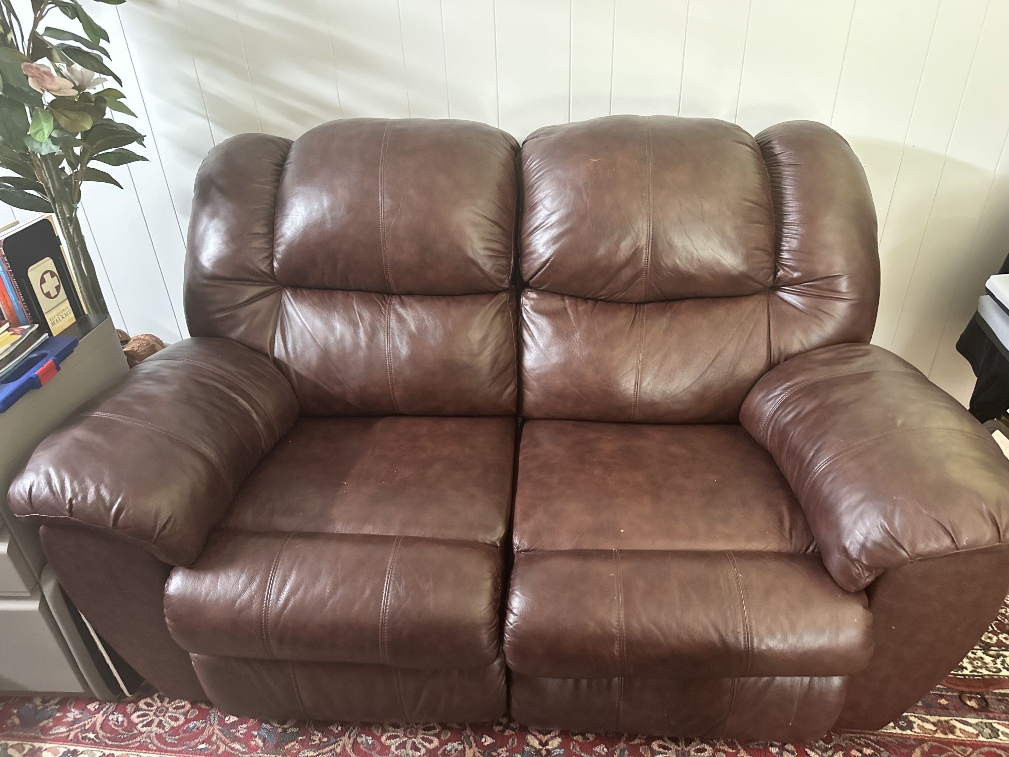 FOR SALE: Reclining Cozy Brown Leather Loveseat – Perfect for two! Gently used with plush cushioning and dual recliners for ultimate comfort. Great for relaxing, reading, or movie nights. Excellent condition from a smoke-free home. Local pickup only. Ashley Furniture Industries, inc. Note: Brown leather upholstery. Built with sturdy wood & metal reinforced frame for long lasting support, 100% top grain leather, high back rest with density foam padding with resilient cushioning. Dimensions for 2 Seater: Length: 5 ft. Width : 21 in Height : 40 in *Floor Panel (deck) to Cushion: 16 in *Both with 1 foot wide × 22 in long plush foam padding arms rest on each side. Pls. reach out for more info. Thanks.