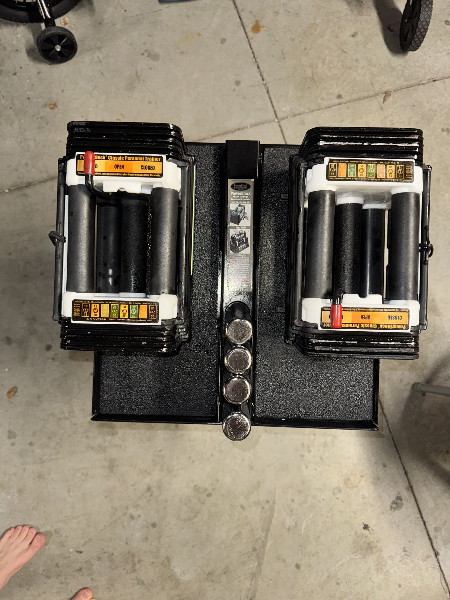 All in one 5-50lb dumbells adjustable Discolored from sun, but no rust they are damn near new. They are perfect for home.