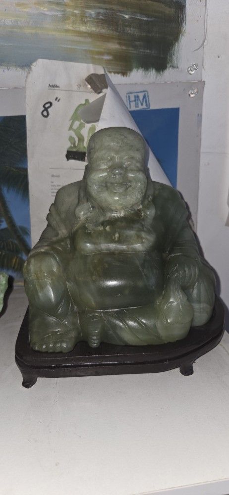 This is a beautiful hand carved happy Buddha holding a cup and a shawl He's carved out of Jade greenstone serpentine the colors are very from lighter to darker translucent green it is an excellent condition and sits on a custom carved rosewood stand he weighs almost 10 lb measures 8 and 1/2 in by 8 in he was purchased by the deceased owner for $1,350 we are selling him for $350 please compare to the 8-in Quan yin being sold by first dibs in New York$900 down from $1,500 see there ad at the end of our photos to see 65 more sculptures please click on my five stars and scroll down we are also interested in trading for a car a truck a van silver dollars or bronze sculptures