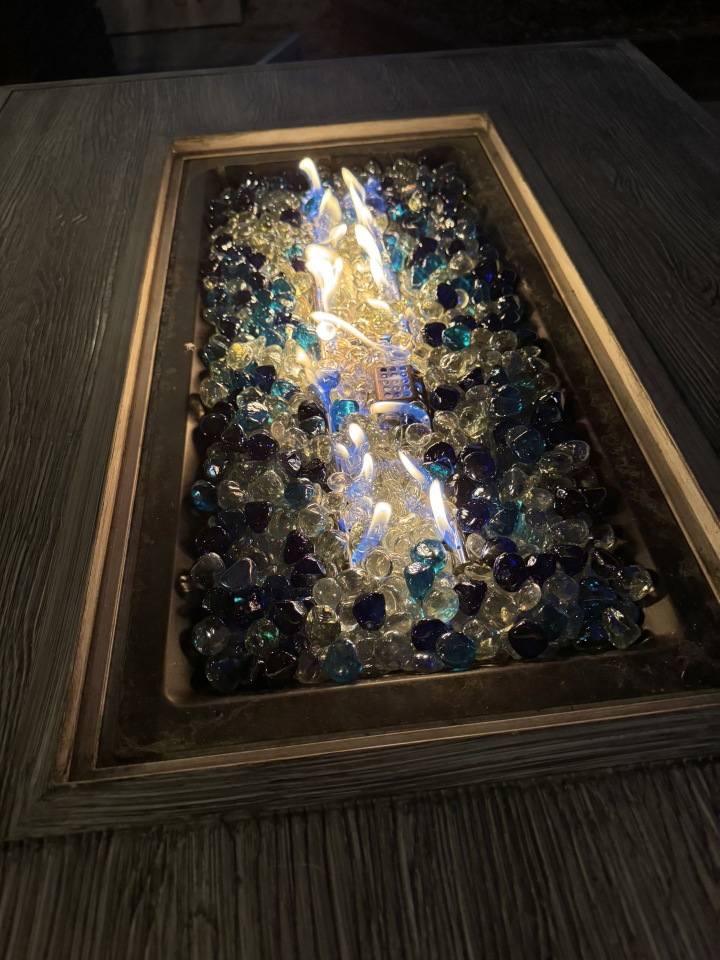 Table with glass stones and fire Patio tabletop Perfect for making S’mores with the family Comes with a tank or without.depending on your offer . 24 tall 36x48 table