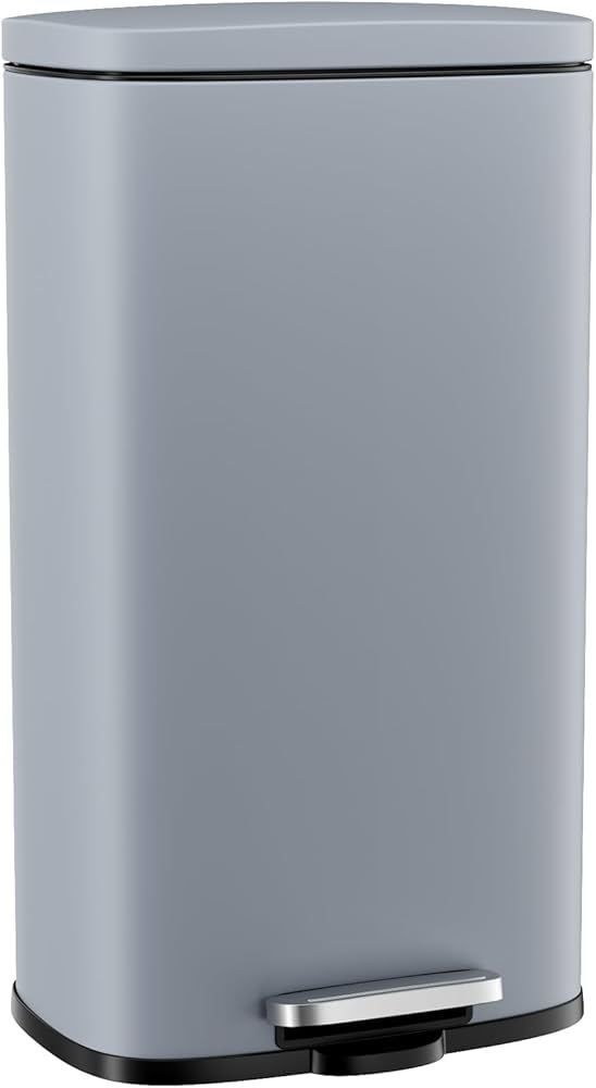B573 $45 13.2 Gallon Step Trash Can, Stainless Steel Garbage Bin, Soft-Close Rubbish Bin with Removable Plastic Inner Bucket, Fingerprint-Proof, Lid Dustbin, Suit for Kitchen Home (Haze Blue, 50L) Capacity 13.2 Gallons Color Haze Blue Opening Mechanism Step-On Recommended Uses For Product INDOOR, KITCHEN Room Type Bedroom 【410 Stainless Steel】30/50L kitchen trash can is made of stainless steel and adopts a wire drawing process. It is not easy to leave fingerprints and easy to clean. It also remains bright and new after long-term use. With the oval shape, it can add elegant and fashionable decoration to your home or office 【30L/50L Large Trash Can】Size is 13.4*9.3*24.6(L*W*H) /16.8*12.3*25.5(L*W*H)inches, and the large capacity of 30/50 Liter provides you with enough garbage storage space, saving you the time of frequent garbage disposal. Stainless steel trash can suitable for large families and offices, it provides more convenient services for your life 【 Silent Lid & Keep Open】Garbage can uses ABS hydraulic deceleration technology and has two slow-closing devices, lid closes gently and slowly with minimal noise. With a light press of the foot pedal, trash can lid opens to 80° without hitting the island counter. You can manually adjust the lid to maintain a 90° opening, freeing your hands for convenient garbage disposal while cooking 【Detachable Inner Bucket & Garbage Bag Fixing Ring】8/13 gallon trash can with plastic inner barrel is convenient for garbage disposal and replacement of garbage bags. The round hole on the top of the barrel can fix the garbage bag well, avoiding the excess part of the garbage bag from accumulating on the side of the barrel. Garbage bags don't easily slip to the bottom of the bin when there's too much garbage 【Handle & Foot Pedal】 Kitchen garbage can has a rear handle, which is ergonomically positioned so you can easily lift it. The professional-grade steel pedals can withstand more than 200,000 pedal strokes, the ABS hinges can withstand more than 400,000 opening and closing cycles 50l bluish grey usatcn1059854