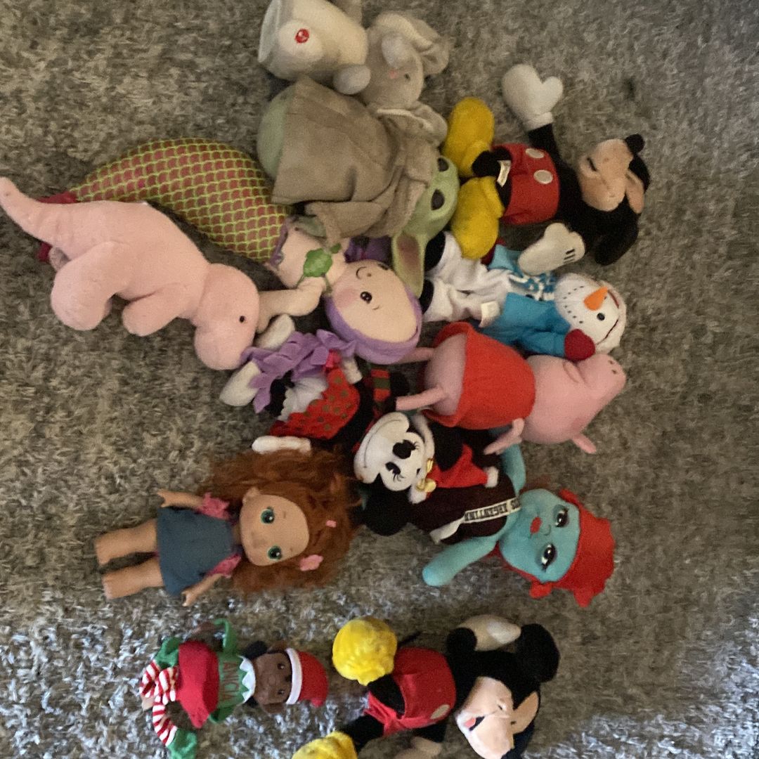 12 flush 2 Mickey 1 miney 1 snow man working 1 miss argentina 1 Star Wars baby 1 pink dinosaur 1 baby elephant 1 marmeid