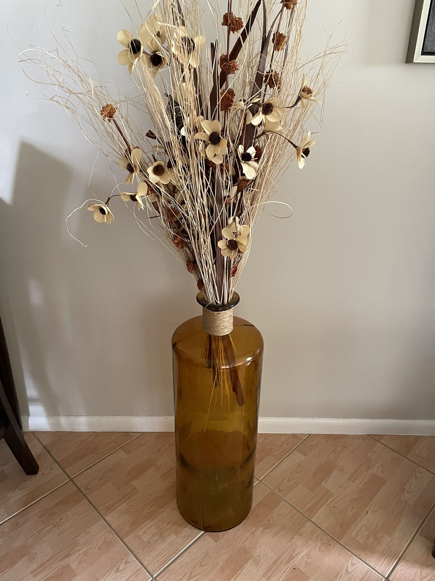 30 inch vase with dried flowers and dried grass. has rope trim around the neck. It is about 10 inches in diameter. Previously displayed but excellent condition.