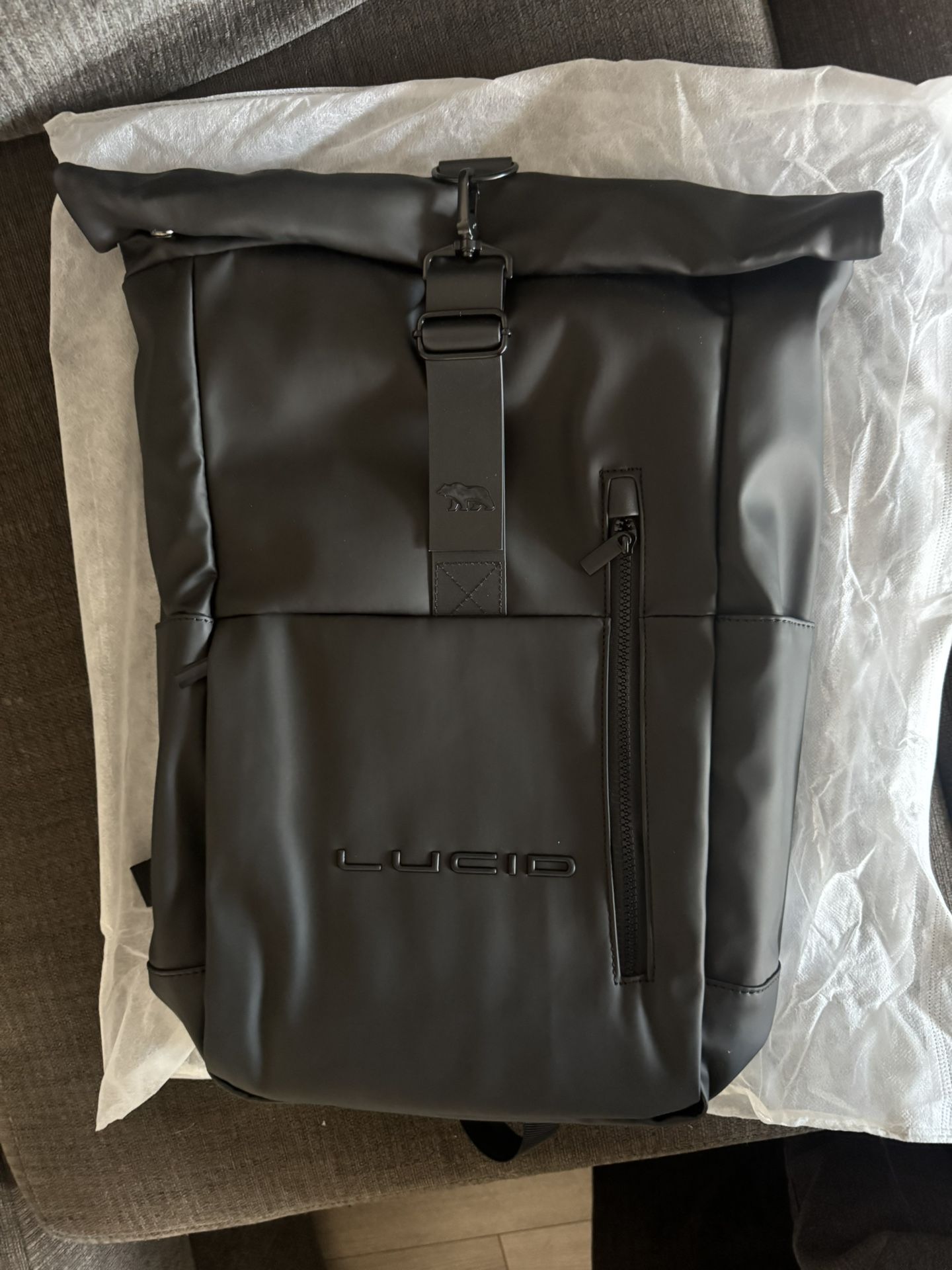 Brand New Lucid Motors Roll-Top Black Backpack — A sleek, versatile bag perfect for everyday use, commuting, travel, or work. Designed with quality materials and thoughtful organization, this backpack offers both style and practicality for daily life. Features: • Roll-top closure for adjustable capacity and secure storage • Multiple compartments to organize essentials — laptop, books, accessories • Padded straps for comfortable wear all day • Durable construction with reinforced stitching and quality zippers • Clean, modern design with subtle Lucid branding — ideal for fans or professionals • Great for travel, school, gym, or daily commute