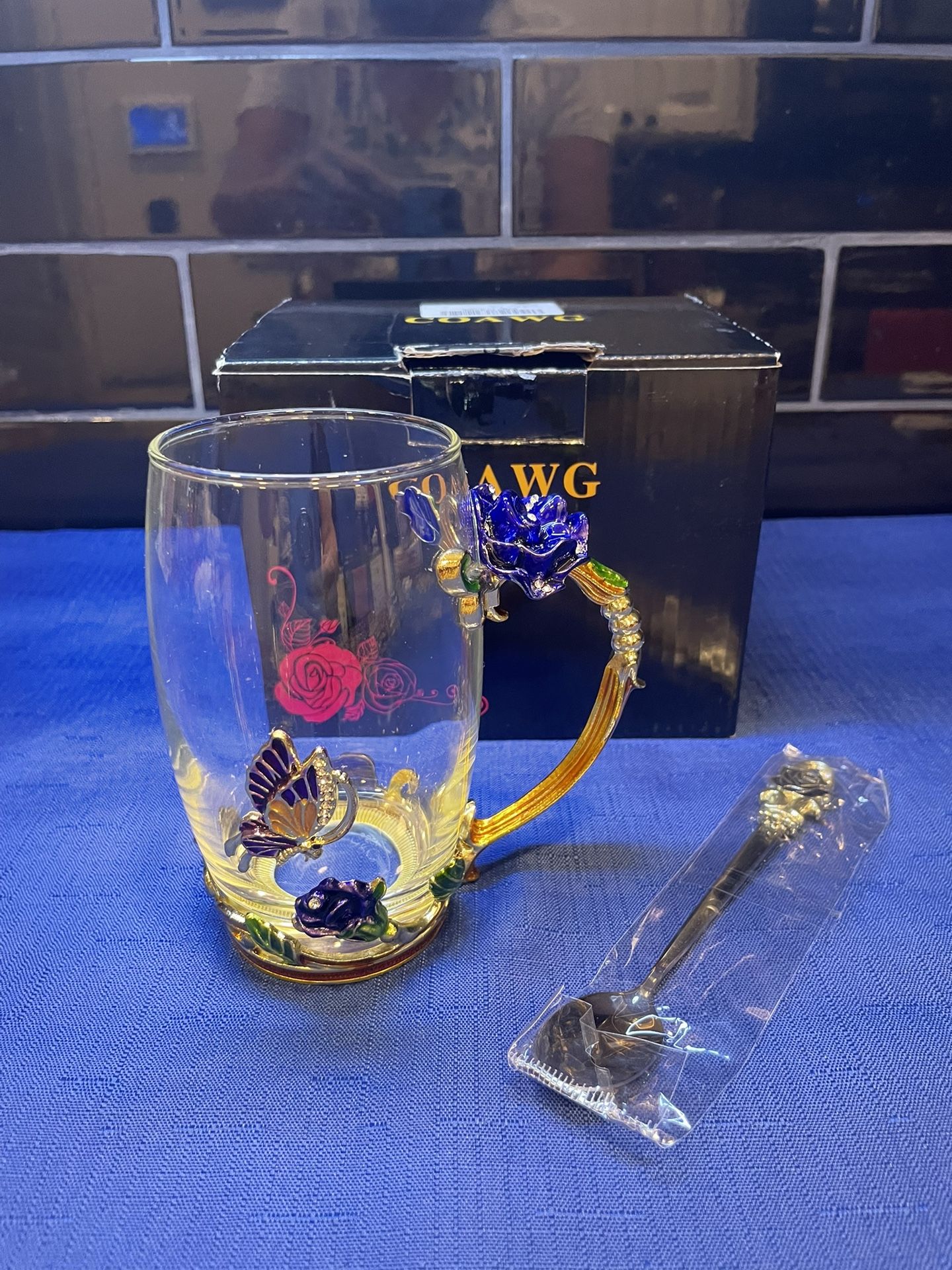 Beautiful new in box enamel glass butterfly mug with flowers and matching spoon. What a stunning way to enjoy your coffee or tea! Beaitful large flower on gold handle in a 3D design. Gold accents and vibrant colors. 5” T X 4.5” W with handle