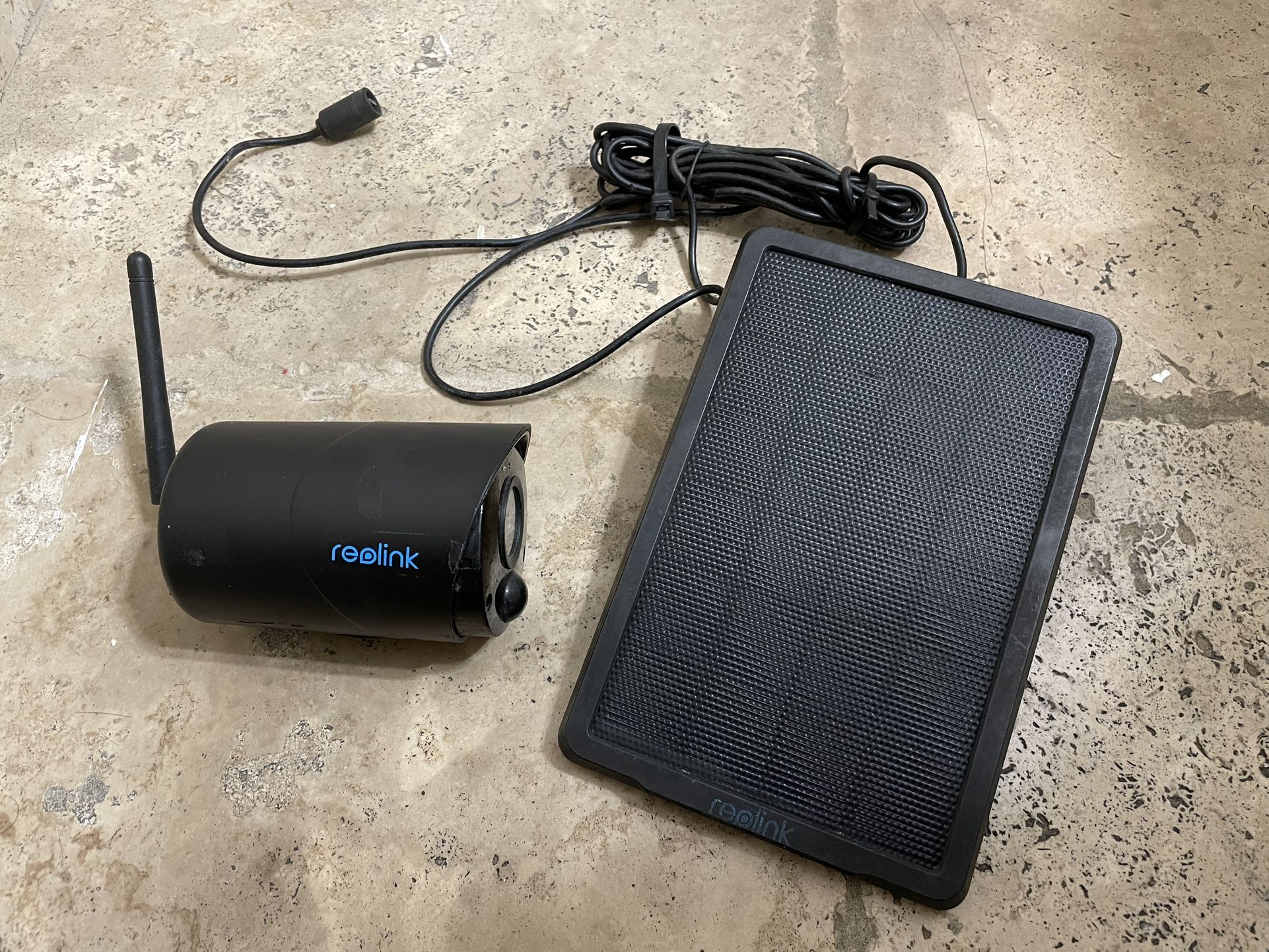 Camera works great. It’s the blacked out version. I might have 1 or 2 mounts not 100% sure. I have to look for it in the garage. Camera and 64GB memory card and solar panel. Reolink Argus Eco- WiFi Camera