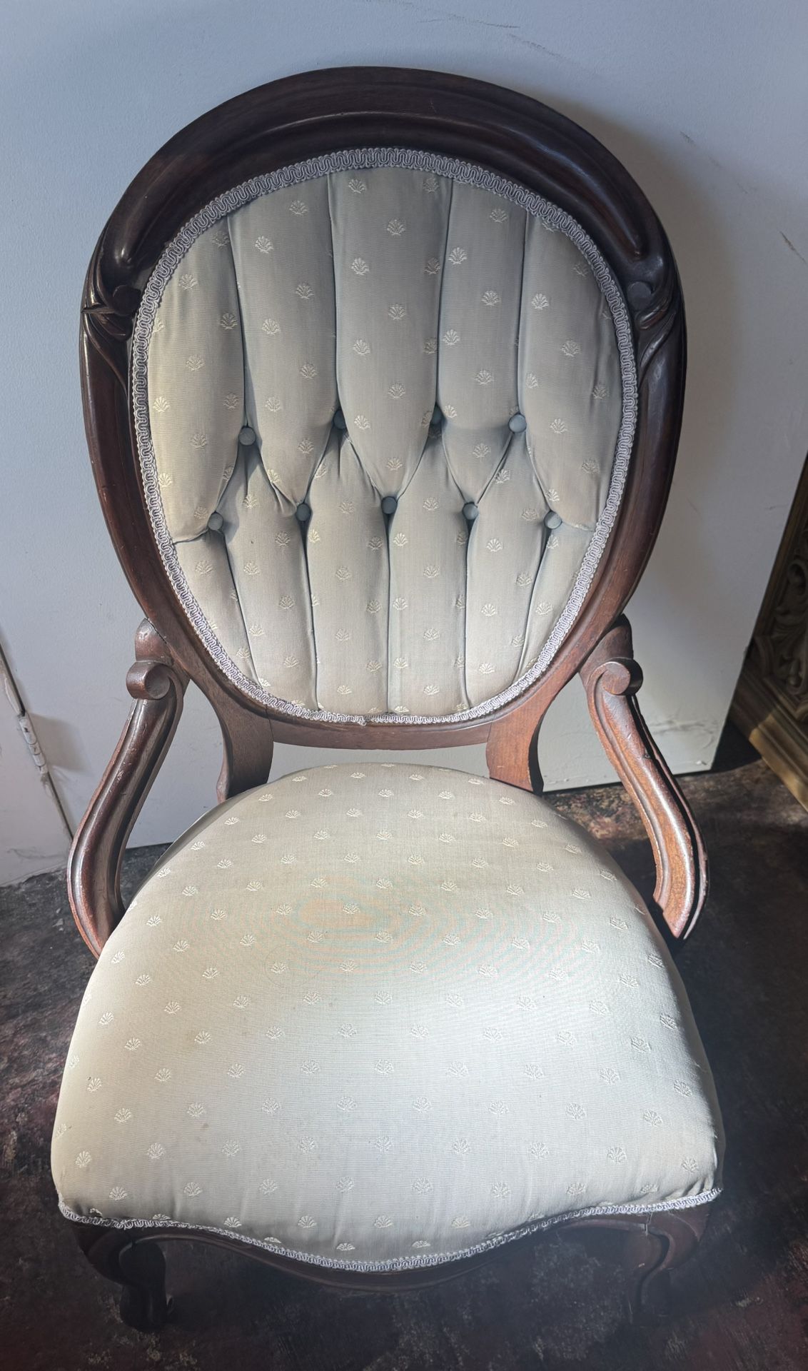 Vintage Victorian Eastlake Style Parlor Chair with Tufted Upholstery. Wheels on front 2 legs. Nice condition Length: ~ 22” Depth: ~ 20” Height: ~ 38”; ~ 17” from floor to top of seat Price: $225 CASH ONLY