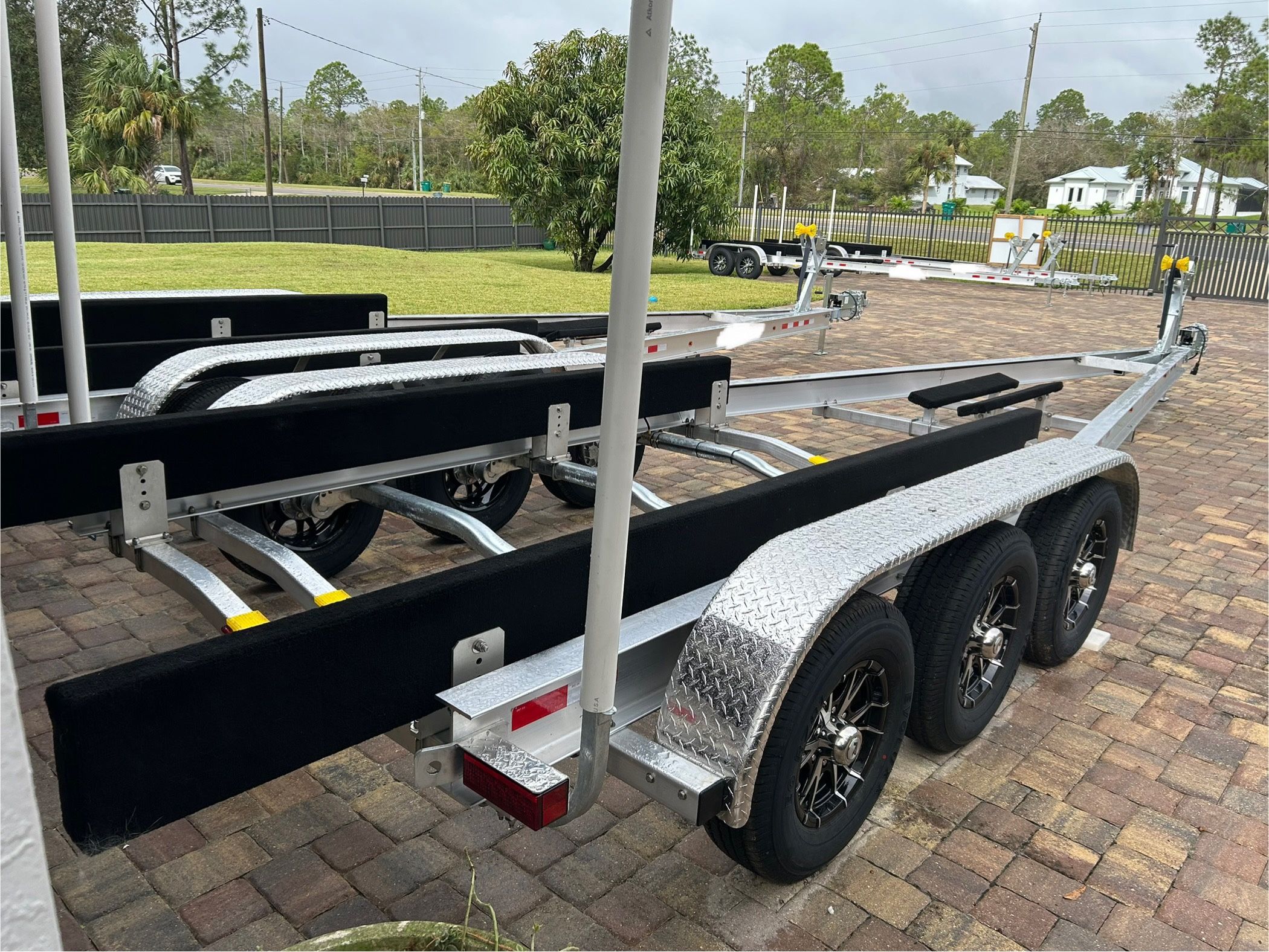 Brand new never touched water we have 5 different trailers in stock ready to get picked up 22-24 , 25-27, 26-28 , 28-30 , 30-32, our 28 and 30 ft both have breaks the rest don’t. Text me your boat specs if your unsure which on works for your boat 👍