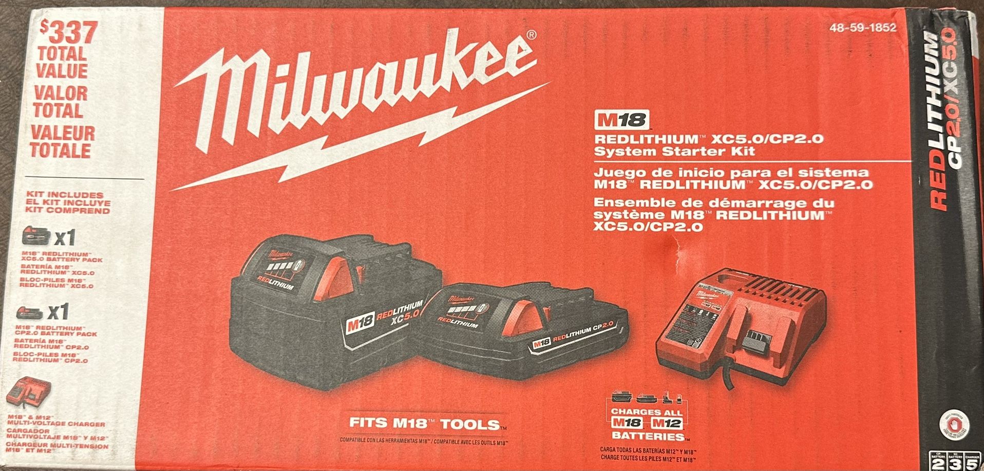 Brand new in box M18 18-Volt Lithium-Ion Starter Kit with One 5.0 Ah and One 2.0 Ah Battery and Charger. Model#: 48-59-1852. Regular price; $249. (PLEASE CHECK OUT MY OTHER LISTINGS). Trusted Seller! Sold over 1000 items on OfferUp. 5 star rating. Shop with confidence.