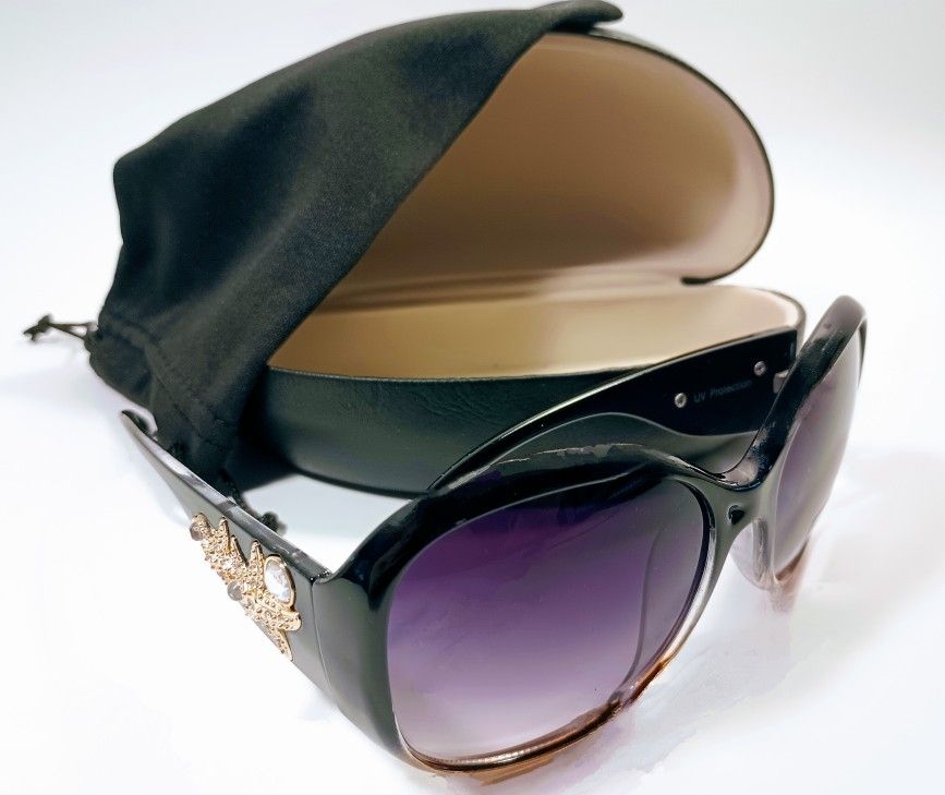 Lady's oversized butterfly sunglasses with gradient black to amber frame featuring starfish embellishments and gradient maroon polycarbonate lenses. A black hard shell sunglass case and microfiber bag included for protection and cleaning.