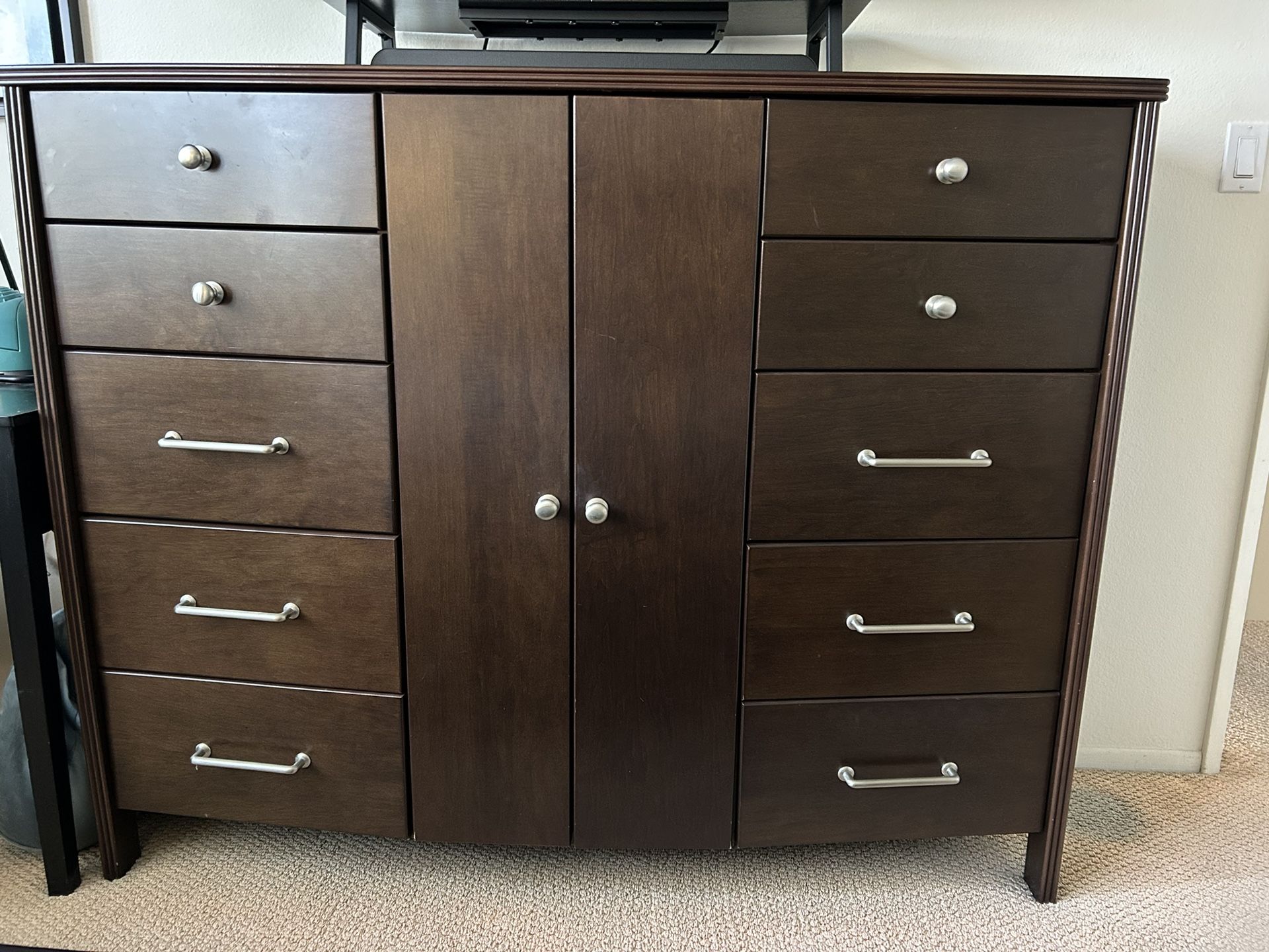 Beautiful, sturdy dresser made in Canada by Laurier Furniture. Solid wood frame with wood veneer drawer fronts — great quality and heavy. Slightly curved front with 10 drawers plus center adjustable shelves behind the doors. Center features jewelry drawer. Exterior: • 48” H • 50.5” L • 18” D Drawer Interior: • 16” L • 5” H • 13.5” D Center Adjustable Shelves: • 17.5” L • 14” D Everything opens and closes smoothly. Light normal wear as shown in photos. Smoke-free home. Pickup only.