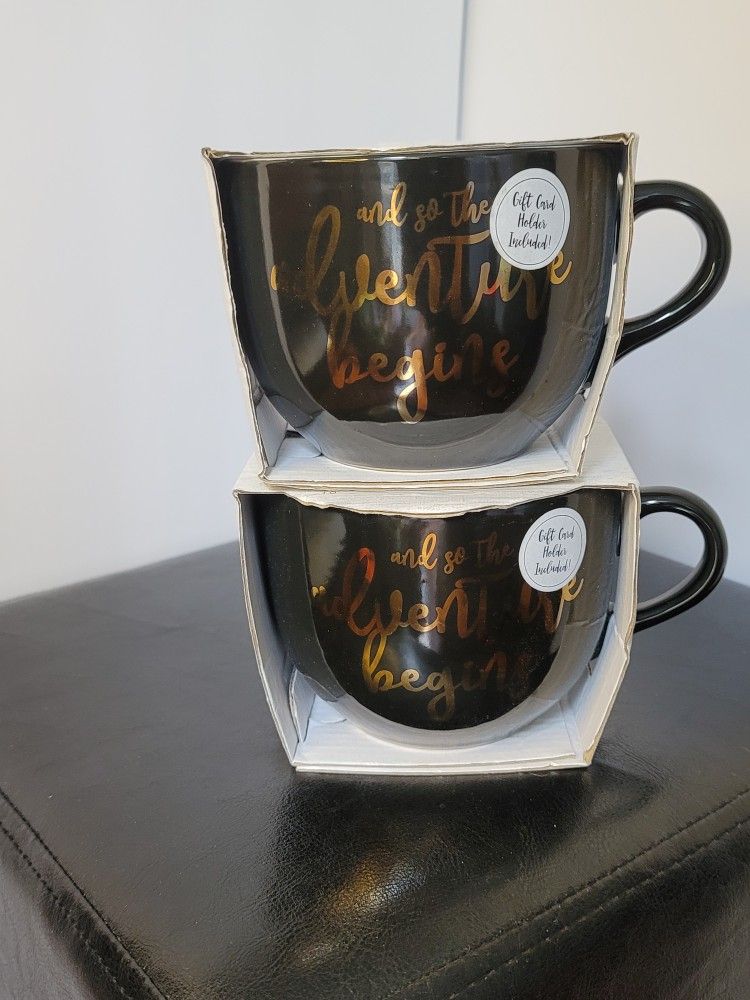 $5 ea OR 3/$12 Black & Gold Soup Mug Brand: Roobee by mara-mi Quote: and so the adventure begins