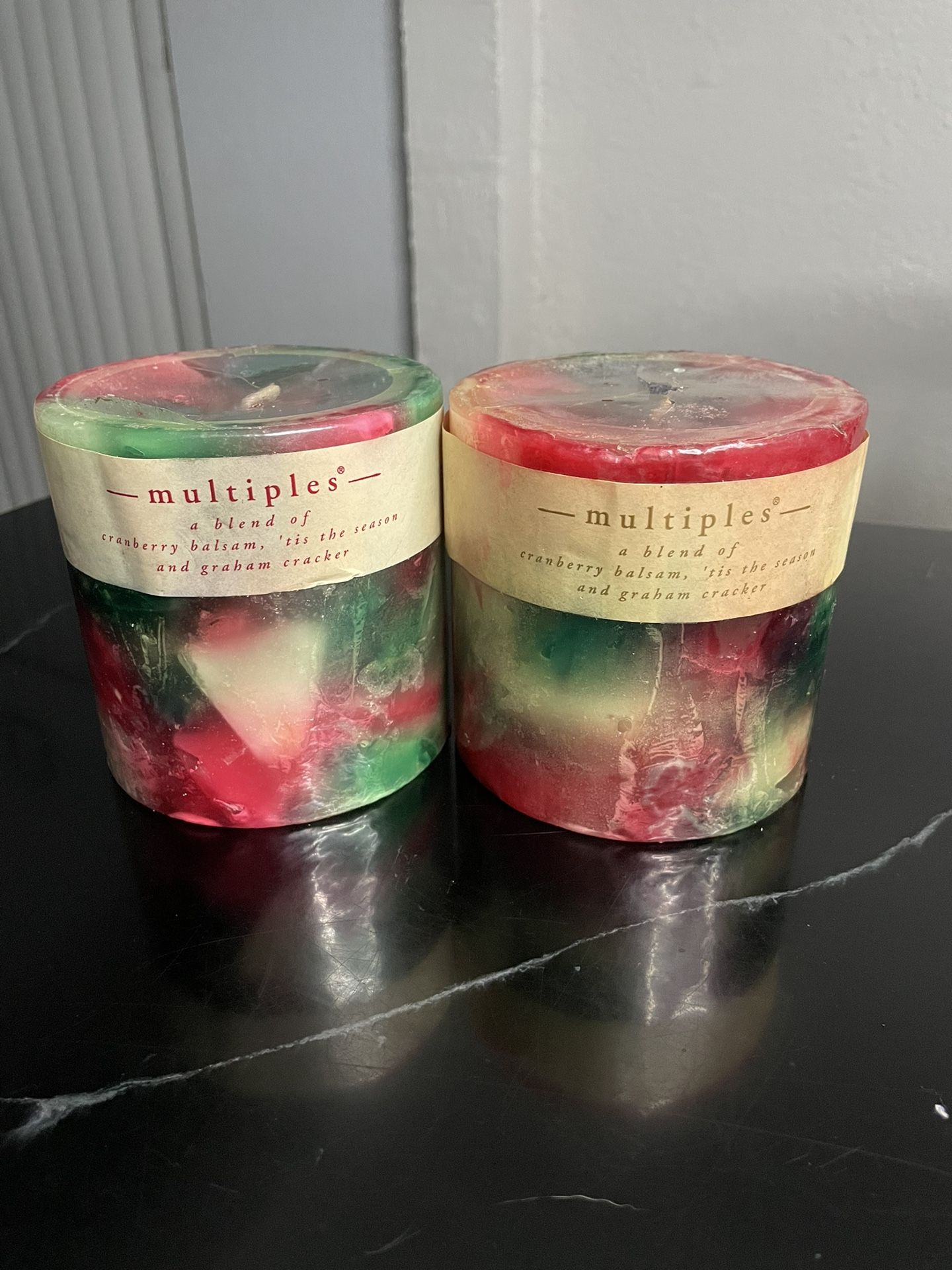 Two new Pier 1 Imports Multiples —-a blend of cranberry balsams, ‘‘tis the season and graham cracker Candle 4”x4” -1 wick candle