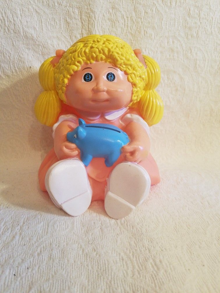 Vintage 1983 Appalachian Artworks Piggy Bank with girl holding her piggy bank. These are the Cabbage Patch Dolls. In good Condition, not stained or Dirty. Normal wear and tear withlittle rub on left cheek. Other flaws which is normal for this type item. Almost 40 years old and still looks good. Measures 6 1/2 Inches Tall, 6 1/2 Inches Across. All Items can be Shipped.