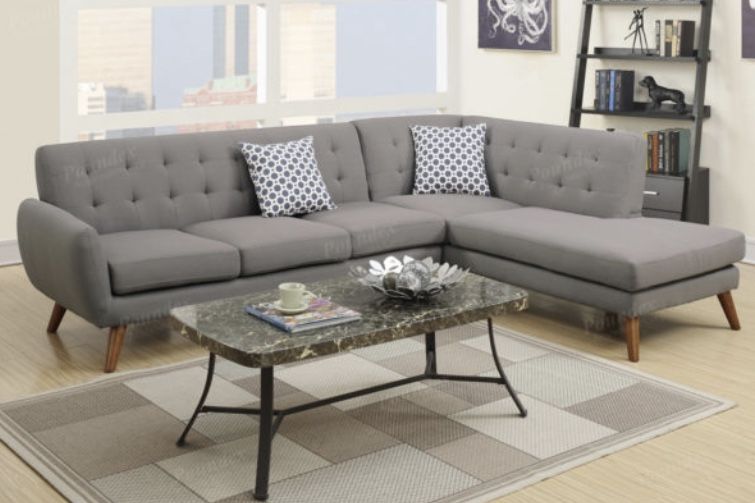 An uptown state of mind, this 2-piece sectional is for the hipster with a unique sense of style. Tightly upholstered with accent tufting on the back supports, this sectional also features a chaise and accent pillows. Sectional Sofa Item # F6953 Color: Grey Available in Grey, Ash black & Laguna Some Assembly Required Materials: Polyfiber Pine Wood Wooden leg Dimensions: Sectional: 111″ x 80″ Chaise: 80″ x 35″ x 33″ Sofa: 76″ x 35″ x 33″H *Chaise is Not Reversible