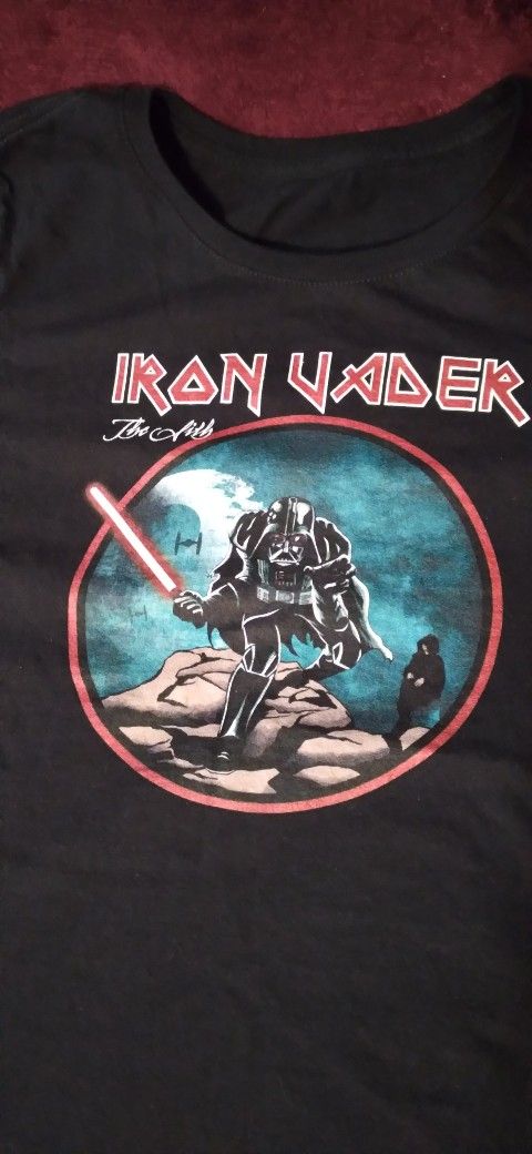 Iron Maiden Style Star Wars Darth Vader shirt. Very cool. Only worm once. My daughter tried it on, and it was a little snug for her. Size petite small adult . Fast shipping from Florida.