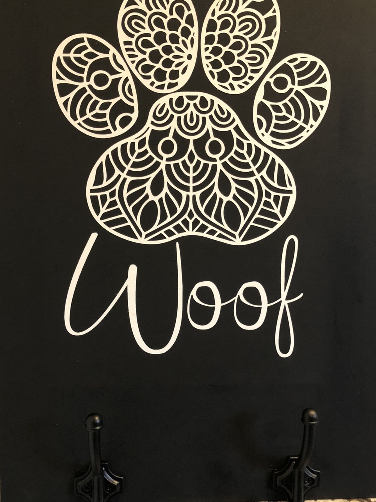 Hand painted “Woof” wood sign. 3/4 inch thick birch plywood. With hooks for your dog’s leashes or your keys! Ready to hang with hook on back