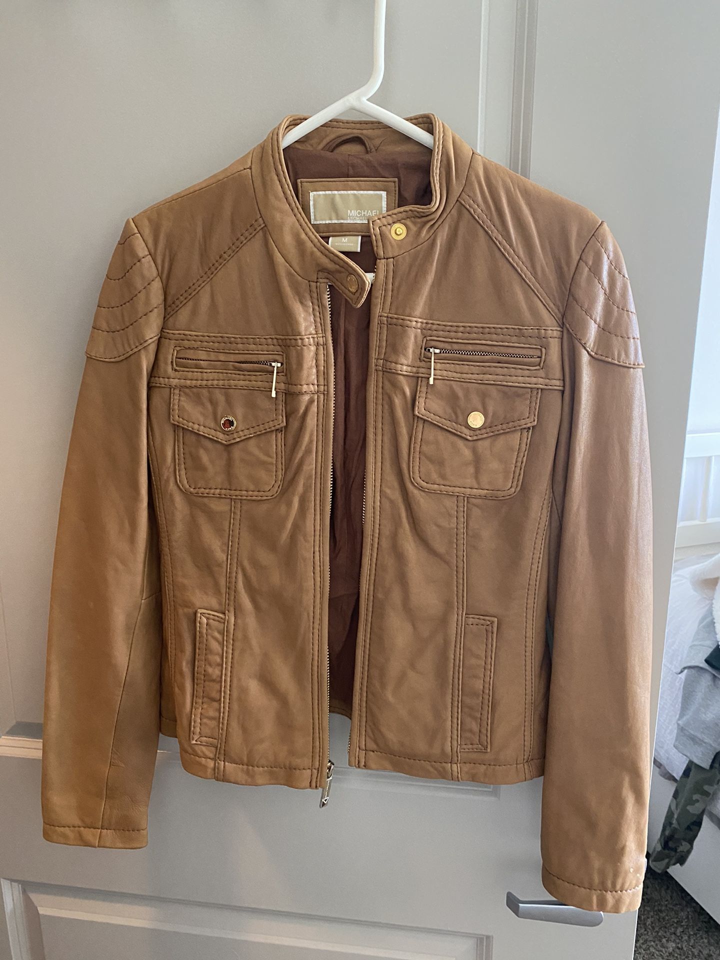 Gorgeous MK Leather jacket Never worn! Tan / Size M Gold zipper + buttons Leather is soft like butter! Retail: $420