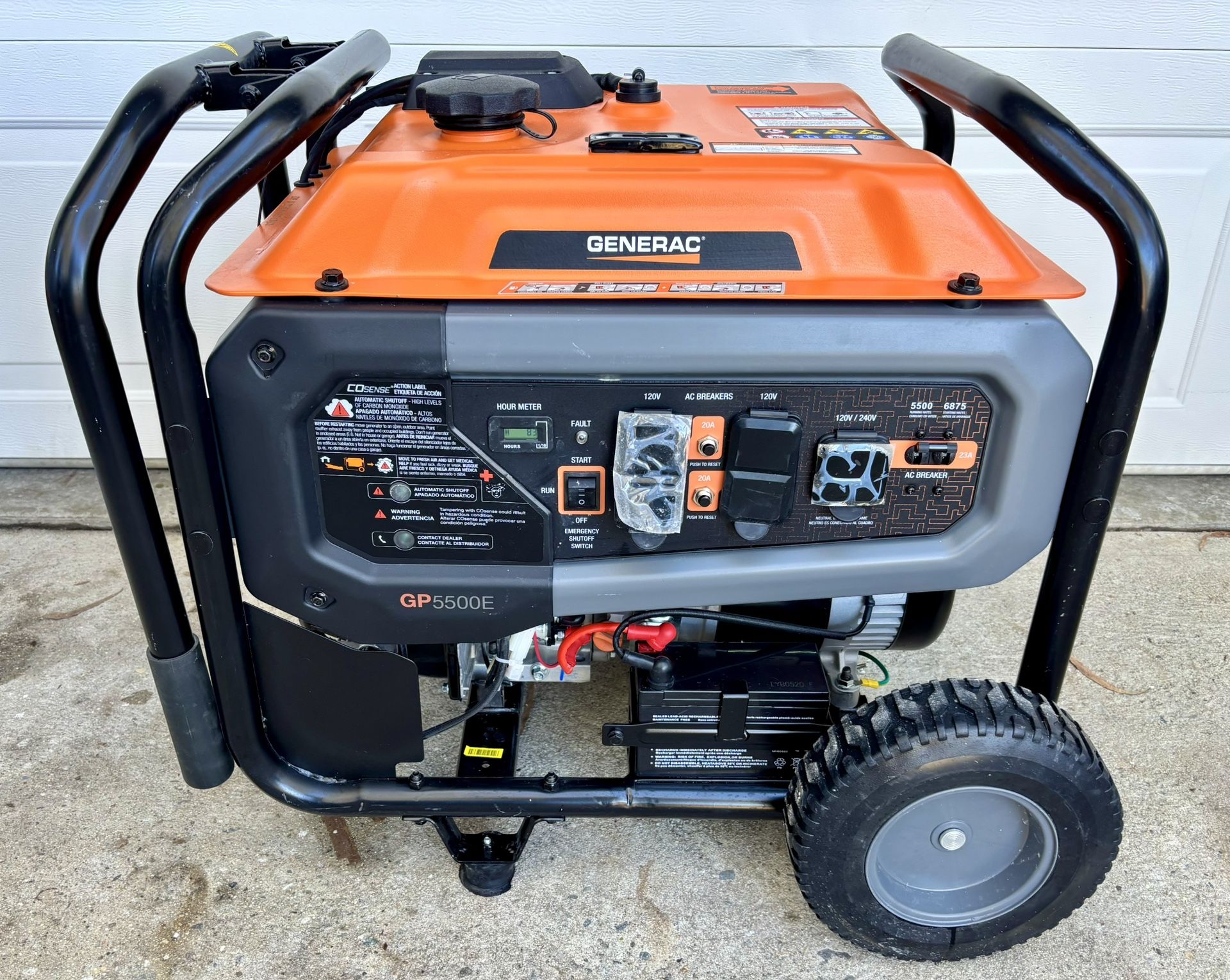 Generac 6875 / 5500-Watt Electric Switch Gasoline Powered Portable Generator with COSense-GP5500E Used once! Dimensions Product Height (in.): 25 in Product Length (in.): 30 in Product Width (in.): 27 in CO Shutoff, Electric Start Fuel Tank Capacity (gal.): 5.4 gal Full load fuel consumption (gallons/hour) : .925 Generator Voltage: 120 Half-Load Run Time (Hours): 10.5 Horsepower (hp): 6 hp Included Wheel Kit Number of Receptacles: 5 Outlet Type: 120V Power/Fuel Type: Gasoline Product Weight (lb.): 163 lb Running Wattage: 5500: Start Type Electric Switch, Recoil Start Starting Wattage: 6875