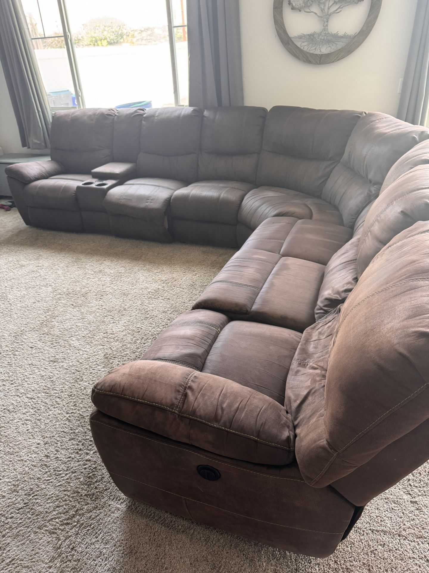 12’ x10’ brown microfiber sectional. Added two sections from display model. Easy to clean and freshly sanitized.