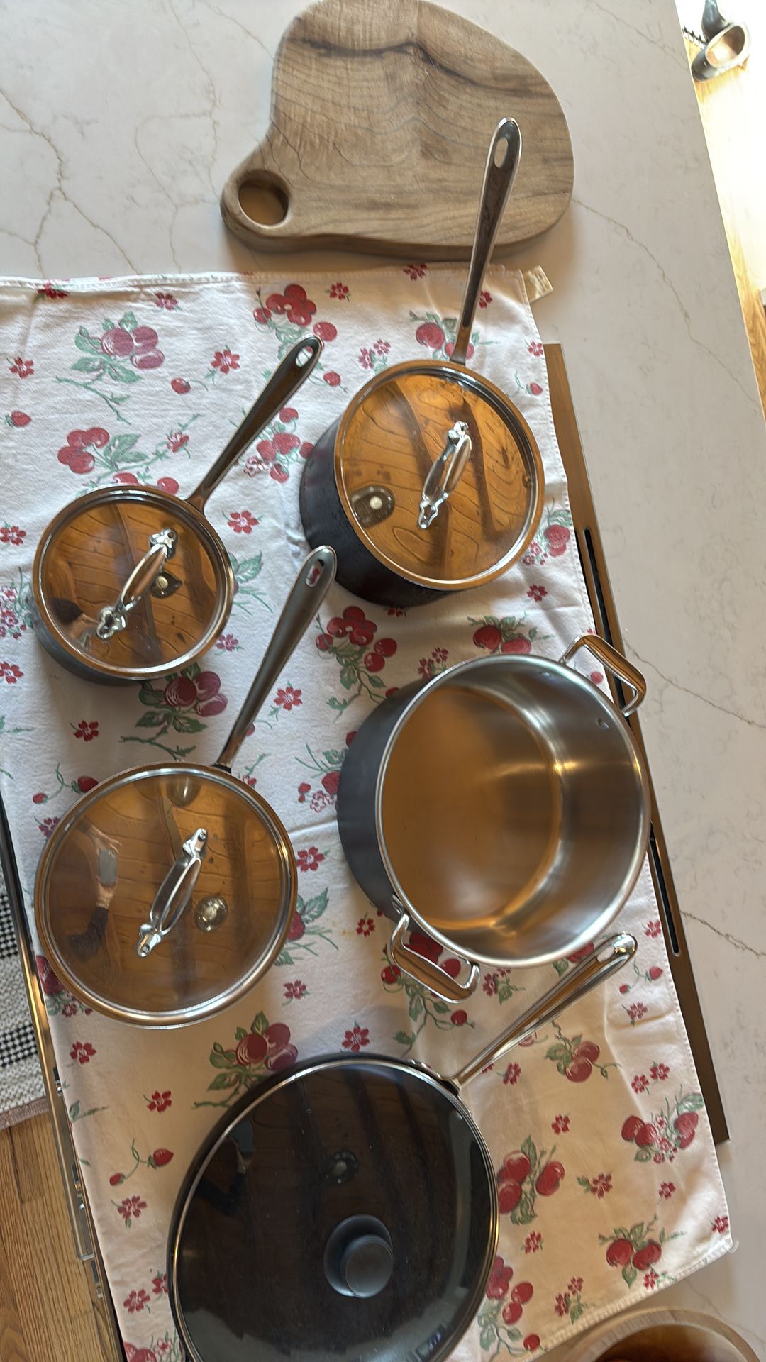 9 piece lot of All Clad. 7 pieces are LTD circa 1990. 12” non-stick is not LTD, but genuine All Clad. Glass lid not All Clad, but fits the 12” skillet perfectly. I can’t use anymore. These are in great condition the large sauce pan could use some TLC, but excellent pieces. Ask for more pics. These are top notch and I’ve taken care of them. Original owner. Non- smoker. Cash only please.