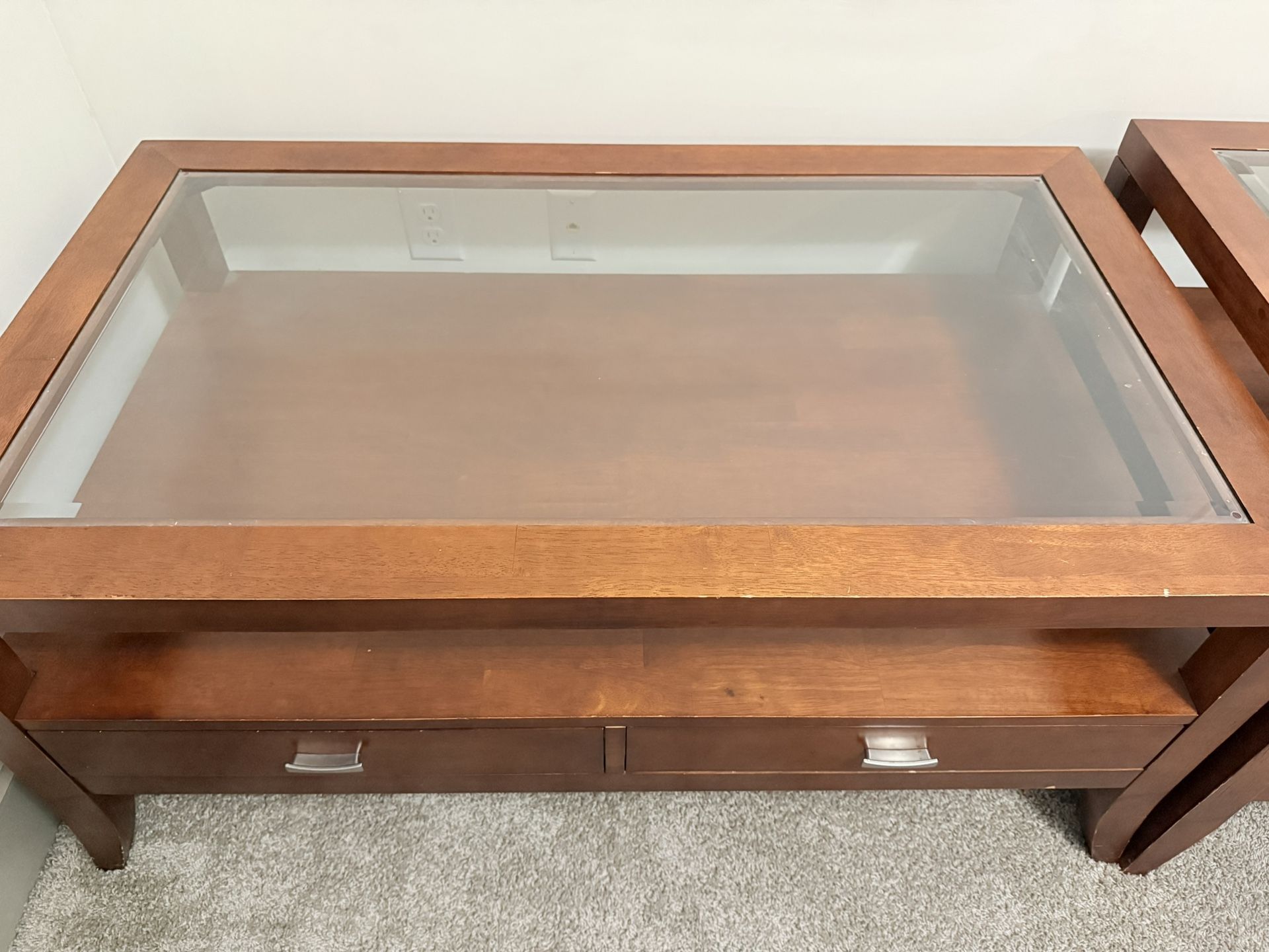 This is a solid wood rectangular coffee table with a warm cherry-brown finish and a modern, sturdy design. It features a clear glass inset top, allowing visibility into the storage space below. Beneath the glass surface is an open display shelf, ideal for showcasing collectibles, books, or décor items. The table also includes two built-in drawers with sleek metal handles, providing convenient hidden storage. Thick legs and a solid frame give the table a durable, high-quality feel, making it both functional and stylish for a living room setup. Dimensions - 48”L * 24”B * 20”H