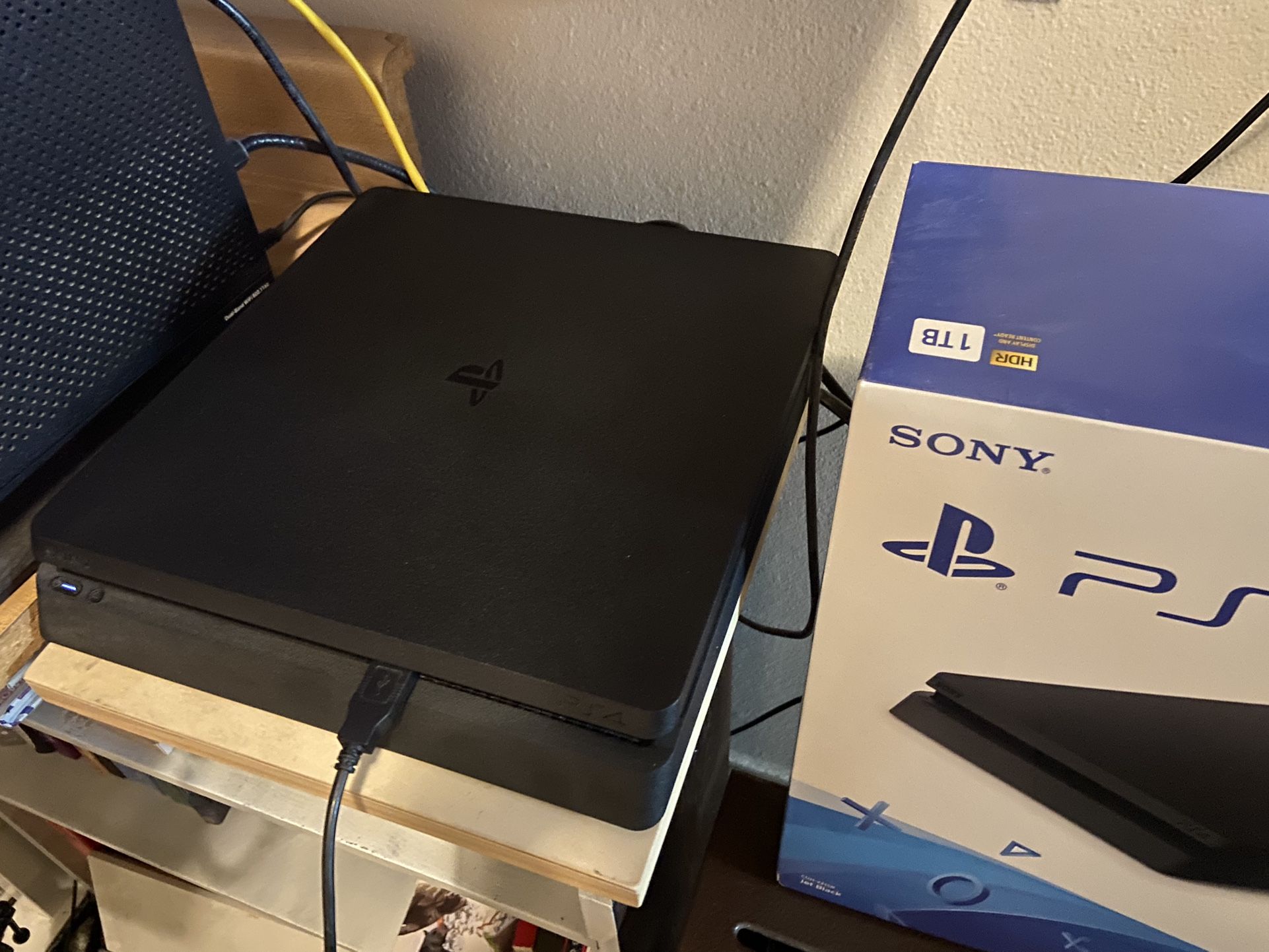 A fairly unused and very clean PS4 slim, all chords and box included. Along with 2 controllers and 2 games. Great idea for a gift! I’ve never had any issues with it and honestly just bought it a year ago. Just haven’t played it as much as I thought I would.