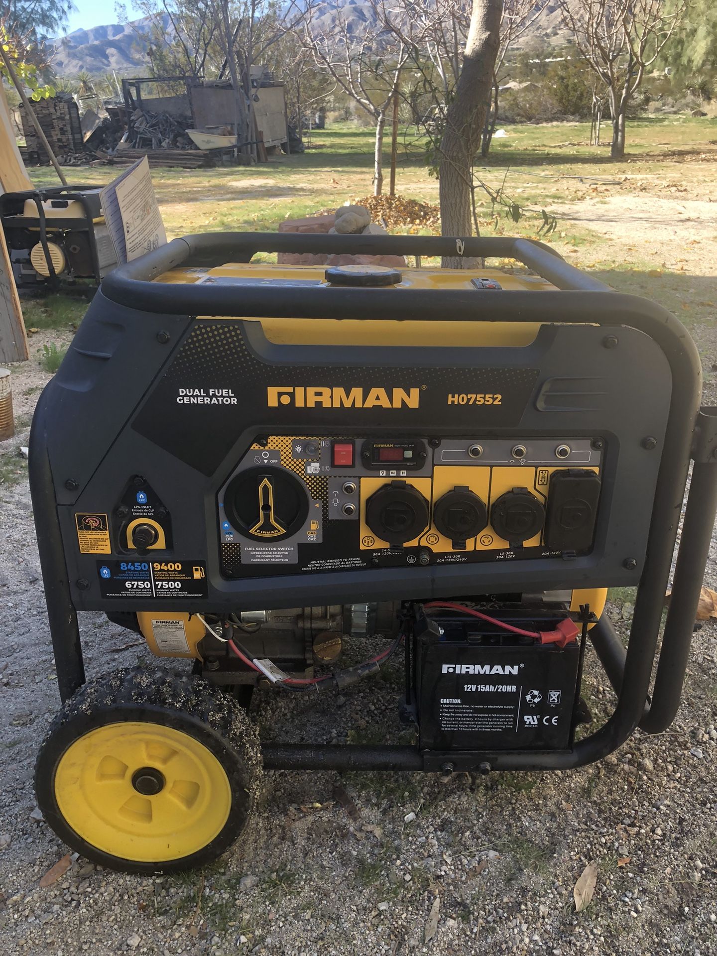 Firman Model H07552 Dual fuel Generator with 8 gal tank 8400 starting watts/7500 running watts. Has 4 Plugs; 1-50amp /240, 2- 30amp120/240 and dual 20amp 120 GFI. Pill start and push button start.