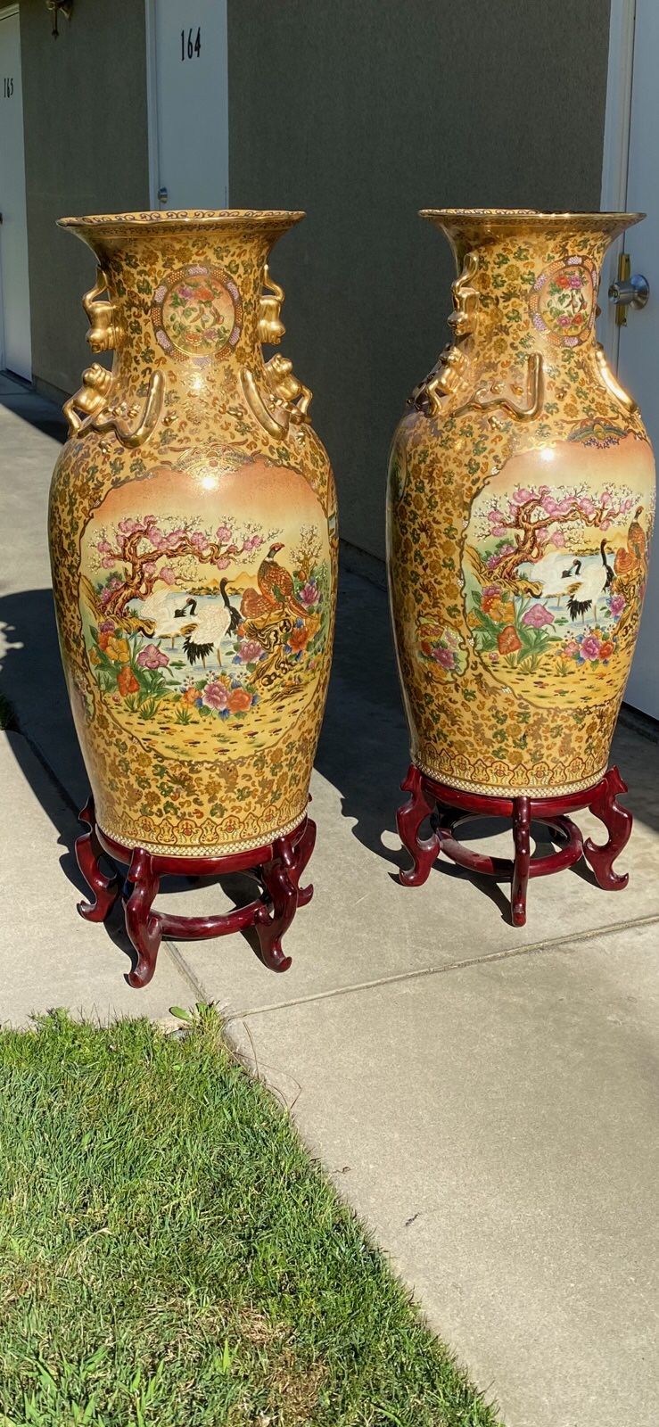 Hand painted w/ gold gilt Height 37” Includes pair of rosewood stands 8 1/2” tall 45 1/2 tall on stands