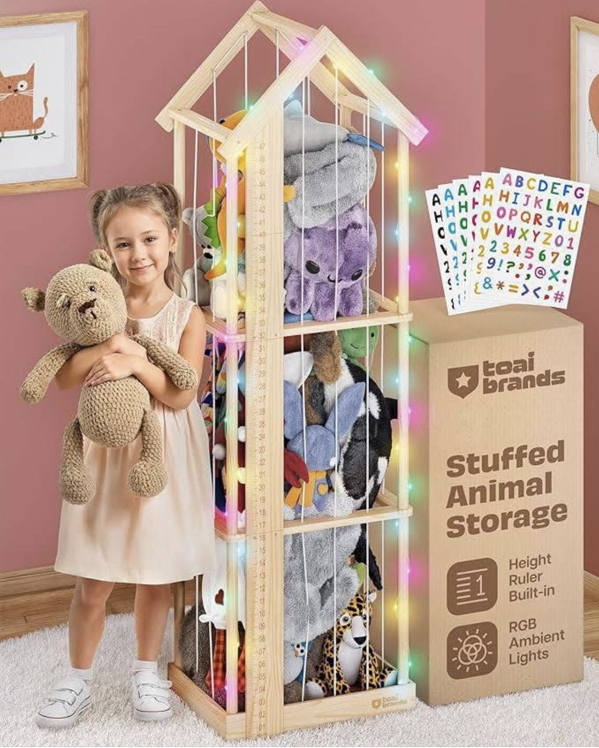 Stuffed Animal Zoo Storage Cage | Wooden Plush Tower Storage | Durable Plush Toy Stuffie Holder | Vertical Jail Organizer with Height Ruler, Stickers & RGB Light (Large)