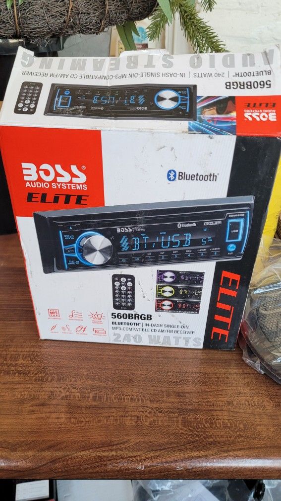 Boss Elite 560BRGB 1-DIN CD Receiver with MP3 Player, Detach Panel, Bluetooth, Multi Color RGB Illumination. Bluetooth Hands Free, Make and receive calls, Bluetooth Audio Streaming. Detachable Front Panel, Wireless Remote, USB Charging, Multi Color Illumination Options. Cash and pick up only.