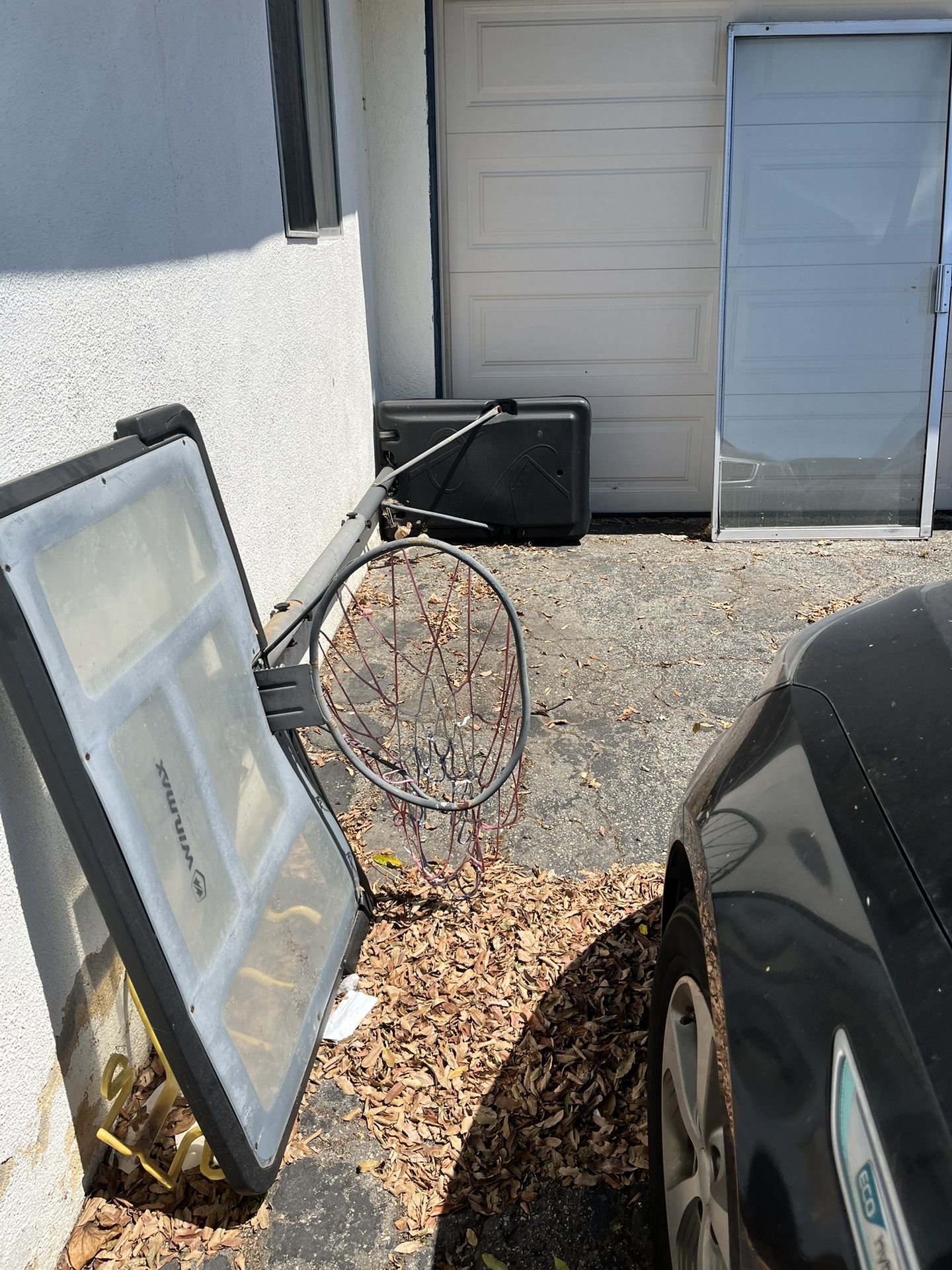 Free basketball hoop. Rim and backboard slightly bent but still salvageable I think