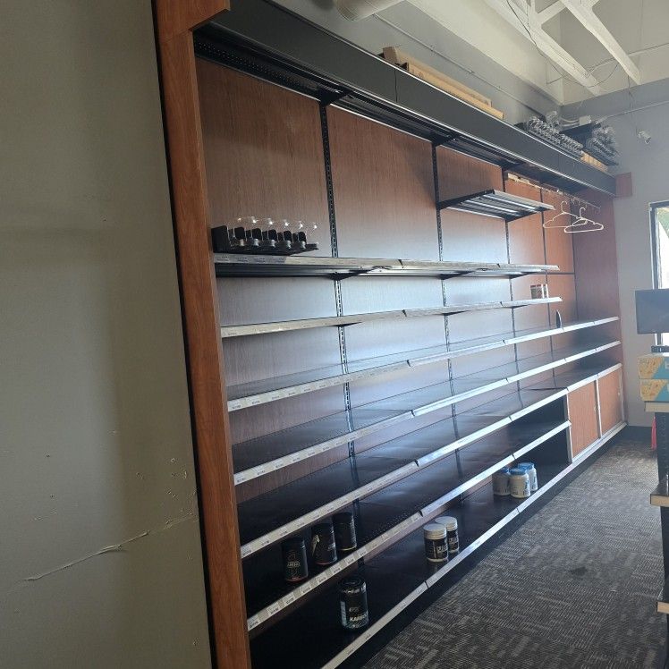 1 - 32' long x 10' tall x 19" deep 1 - 18' long x 10' tall x 16" deep 2 - island 6' x 54" tall x 13 deep 4 - endcaps 30"W x 54" tall x 13" deep 1 - 10' long x 42" tall x 13" retail counter