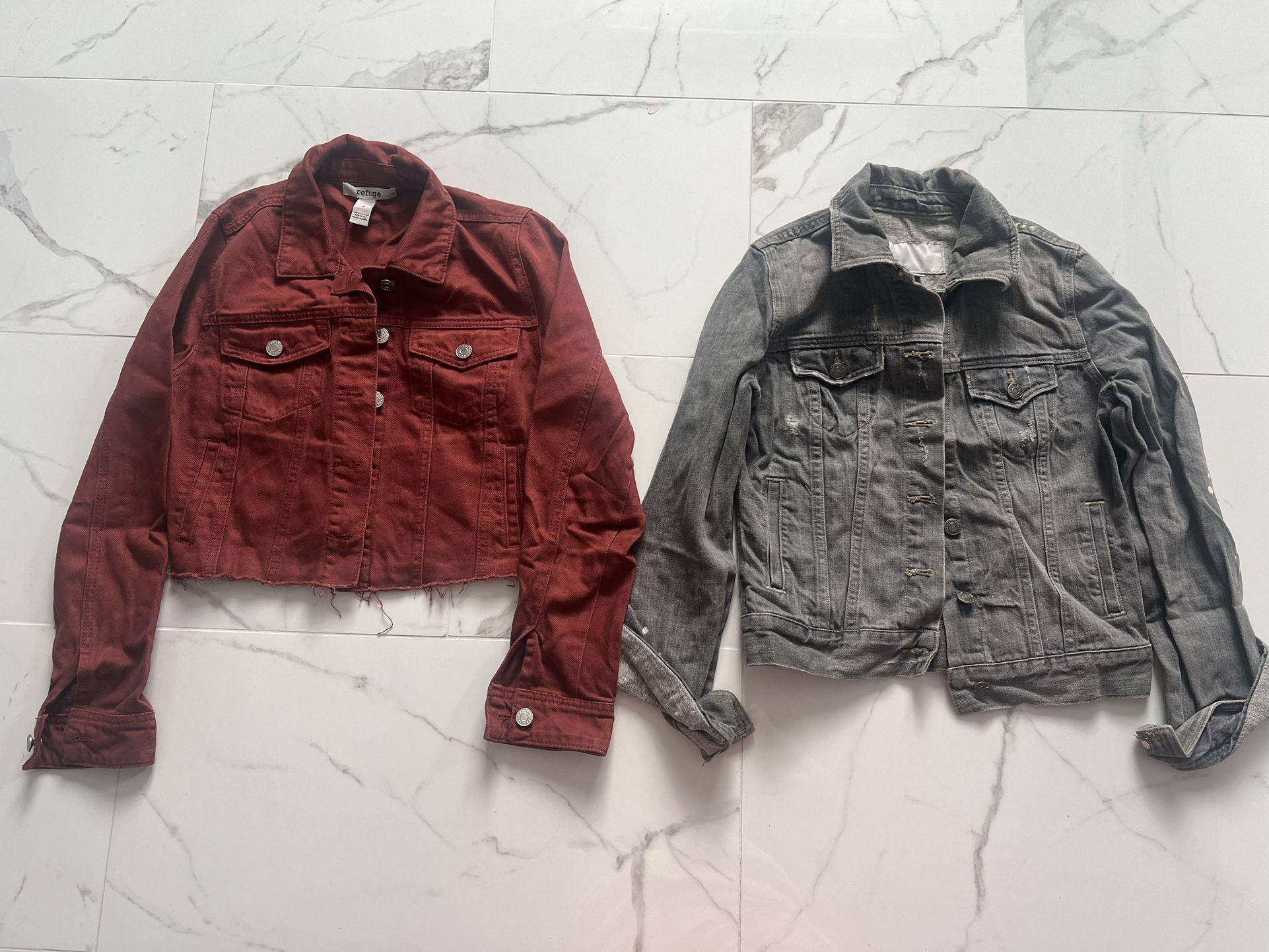 Washed our grey jean jacket with some white splotches SIZE XS Burnt Orange cropped jean jacket SIZE S $15 each
