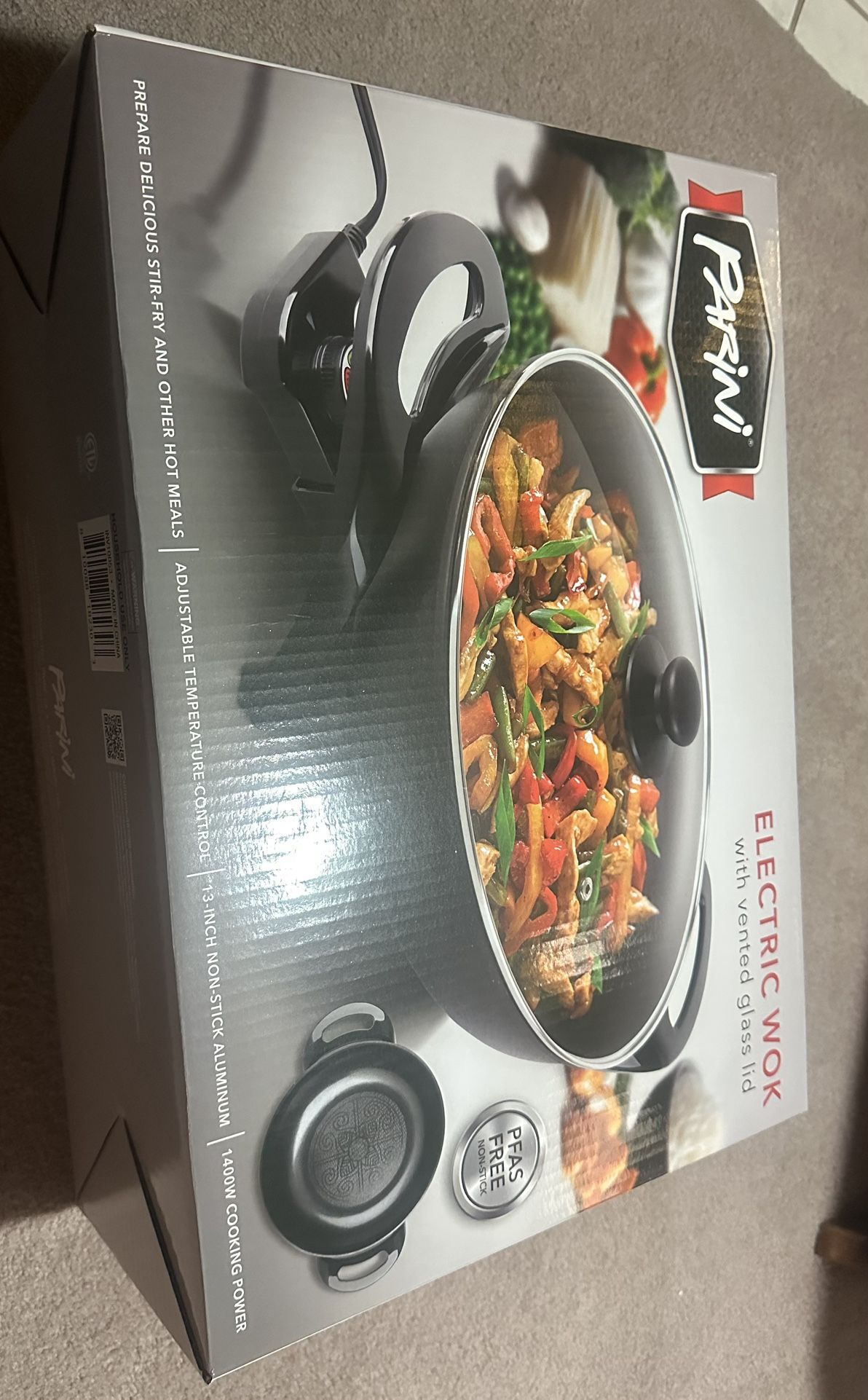 New in box electric wok 1400 watt. Non stick braise steam poach and boil. 13 inch aluminum body