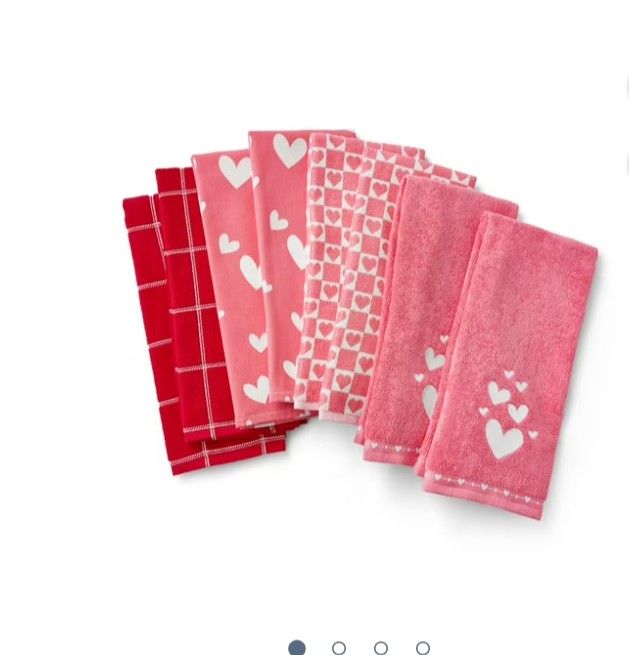Set of towels with heart patterns in pink and red. Perfect for adding a touch of love to your space. Set of 8 towels – each measuring 17" x 28" Soft and absorbent for everyday kitchen use Easy care – machine washable for quick cleanup Mix of styles – includes embroidered, printed, and patterned designs to complement any décor Set of 8 kitchen towels – includes embroidered, solid, printed, and woven terry designs Soft and absorbent – perfect for drying dishes, wiping counters, and cleaning spills Versatile style – complements any kitchen décor with a simple, elegant look Durable cotton construction – built for everyday use and lasting performance Functional & decorative – adds both charm and practicality to your kitchen Set of 8 towels – each measuring 17" x 28" Soft and absorbent for everyday kitchen use Easy care – machine washable for quick cleanup Mix of styles – includes embroidered, printed, and patterned designs to complement any décor