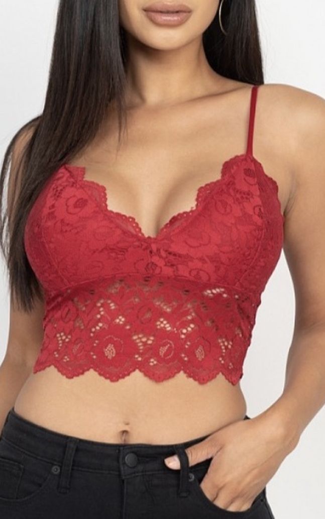Size S,M,L A cropped floral lace see through bralete featuring a sheer eyelash lace bodice, padded cups, sweetheart neckline, and straight back cut.