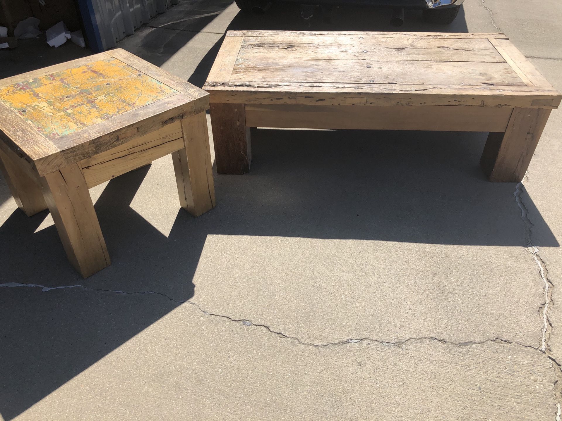 This coffee table and matching end table are made from reclaimed railroad ties. They are real heavy and very sturdy. They retail for over $1200 for the set. Offers at half my asking price will be ignored. Please look at all the pictures. They do have some imperfections that make the tables more desirable.