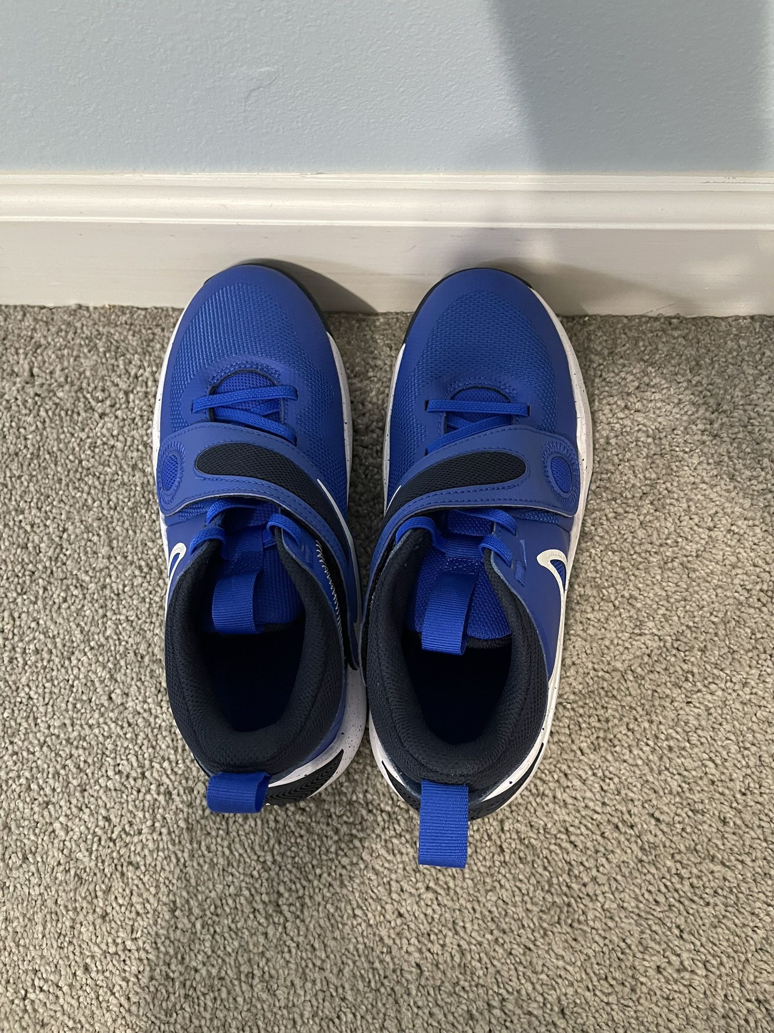 Nike team hustle D II, size 5.5 sneaker, Blue, black and white, Wore 1 time, For $25.00. Pick up at house.
