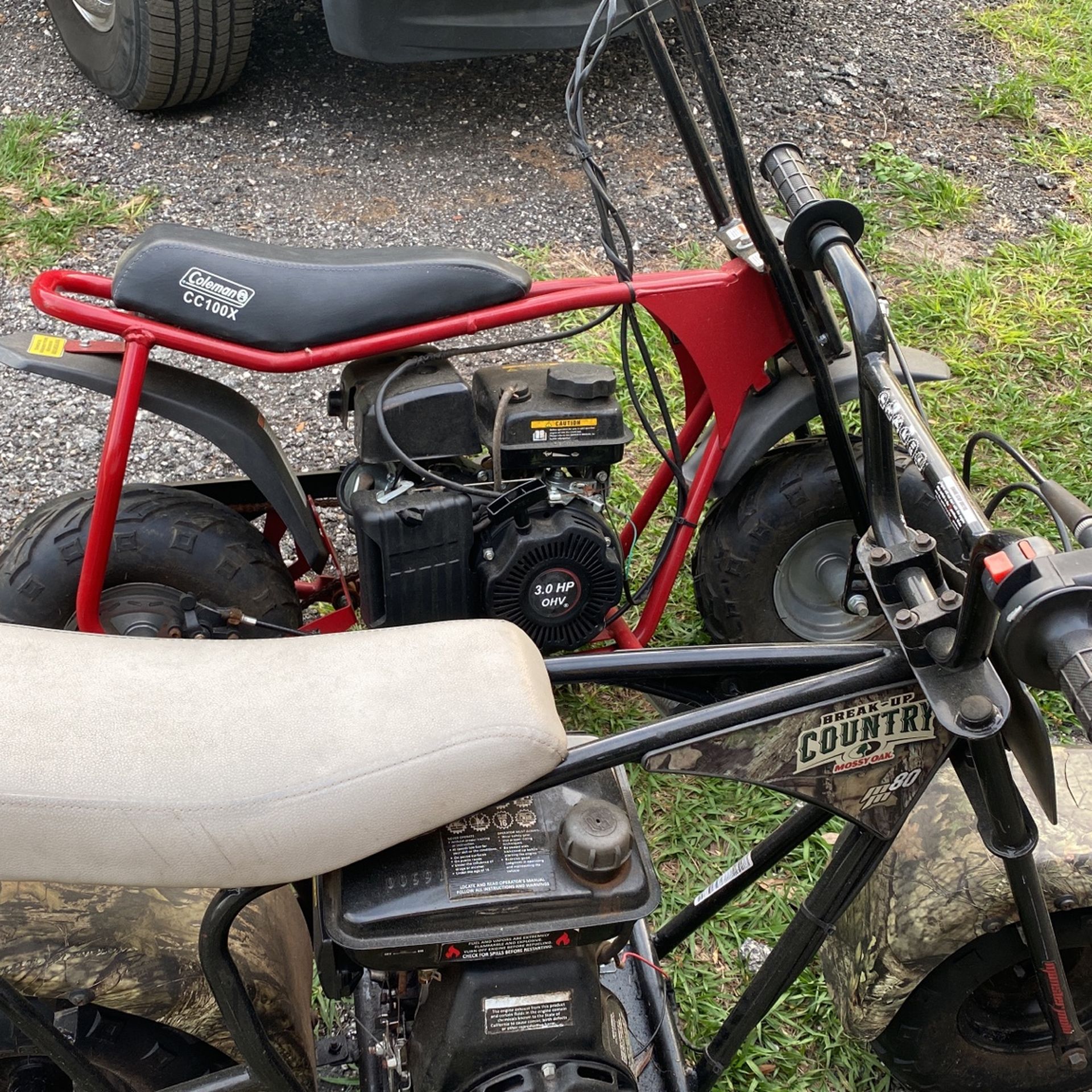 Monster moto 80 -new clutch -new fuel lines -carb cleaned -I have a new chain as well as master links -has only been ran with non-ethanol gas -full synthetic oil Coleman cc100x -has a new air box cover and filter only ever ridden a handful of times Does need a new chain as it has been sitting Both bikes run and drive,are fun toys for your kids or adults. PRICE IS FIRM